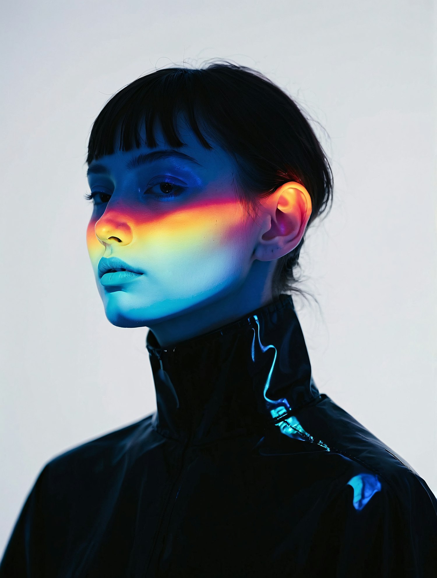 A futuristic portrait of a woman with rainbow light across her face, wearing a glossy black jacket against a neutral background.