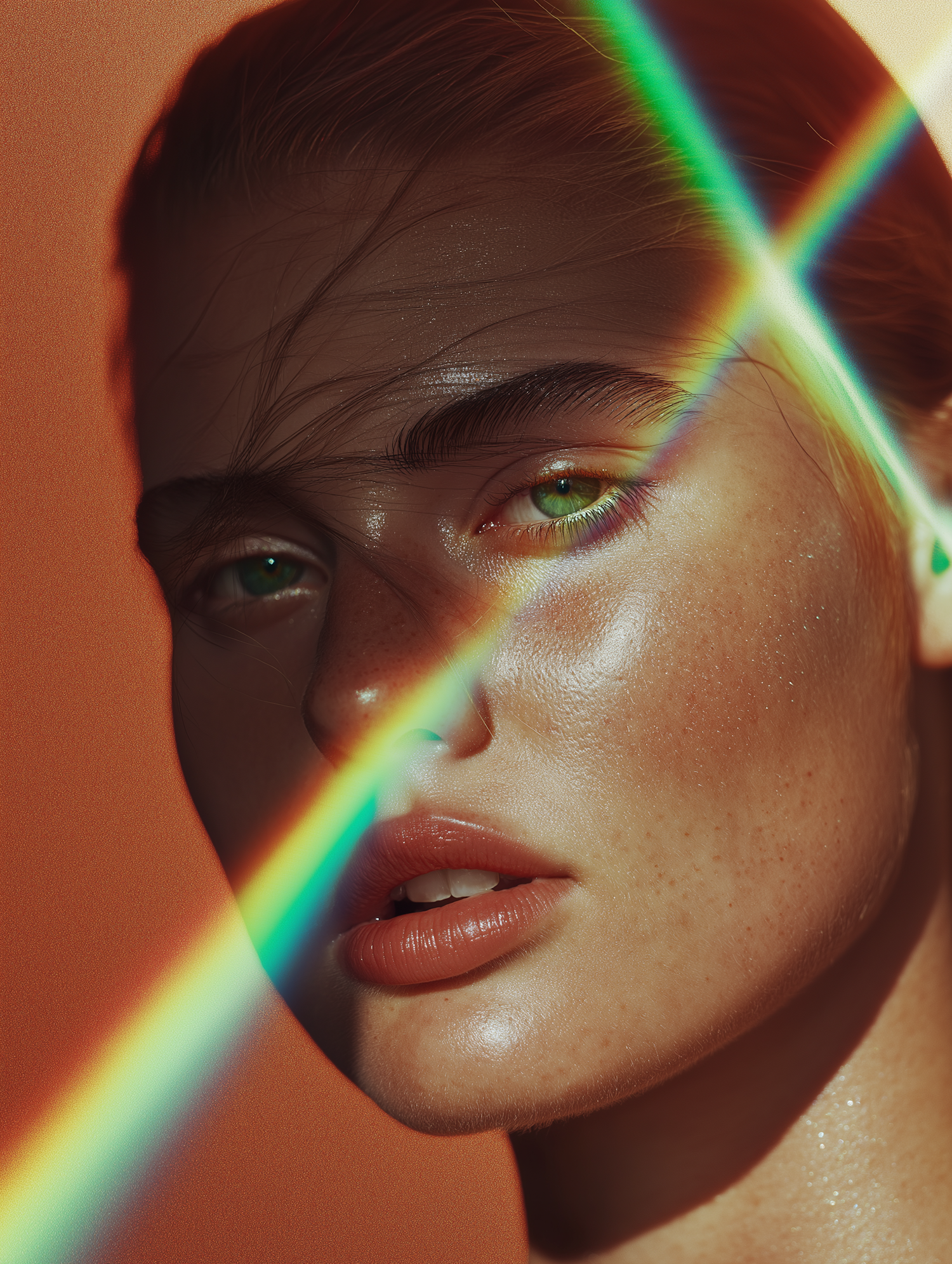 Close-up of a person with green eyes and a rainbow light across their face, set against a warm orange background.