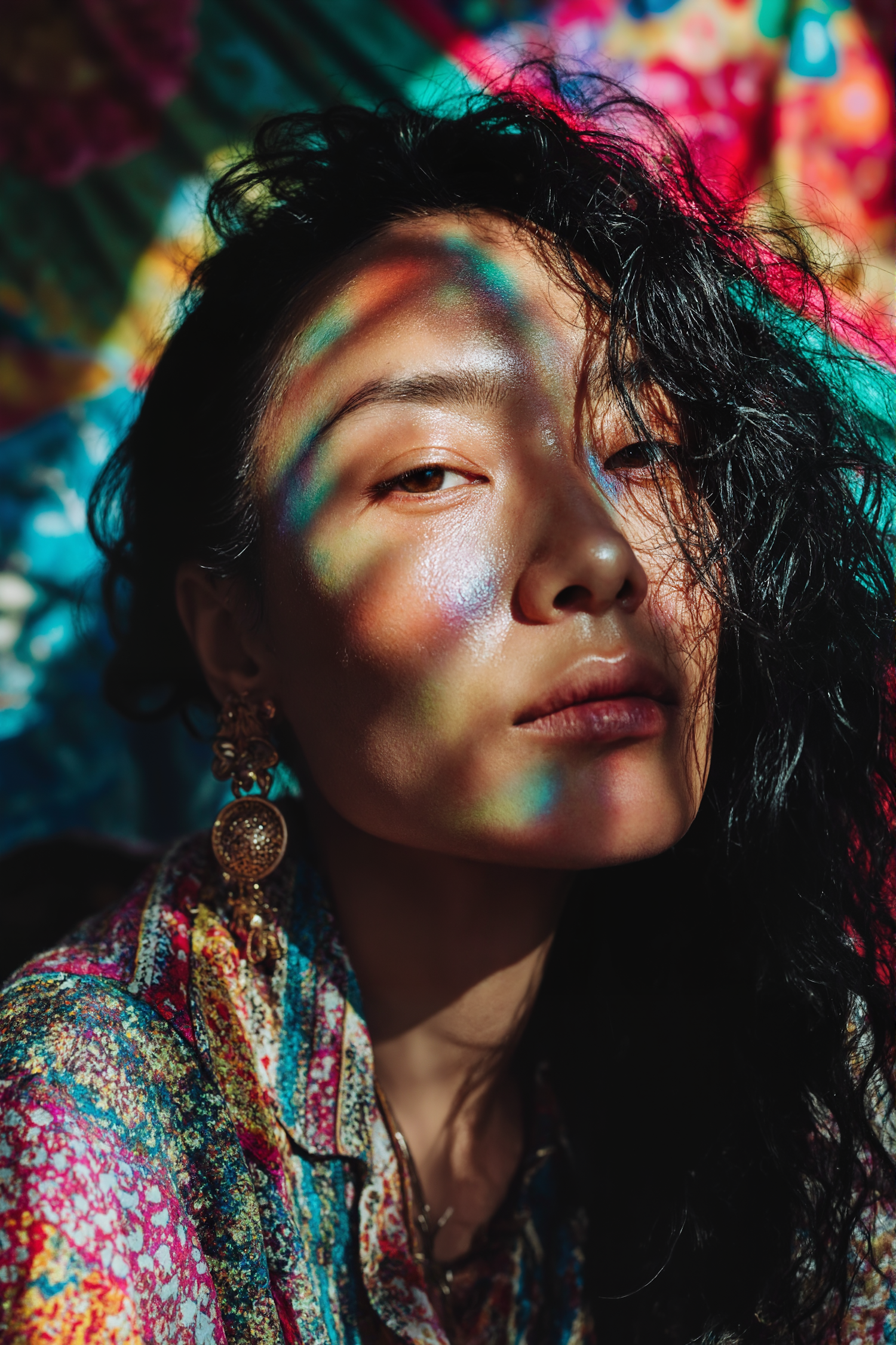 Close-up of a woman with rainbow light patterns on her face, wearing gold earrings and a colorful shirt, set against a vibrant background.