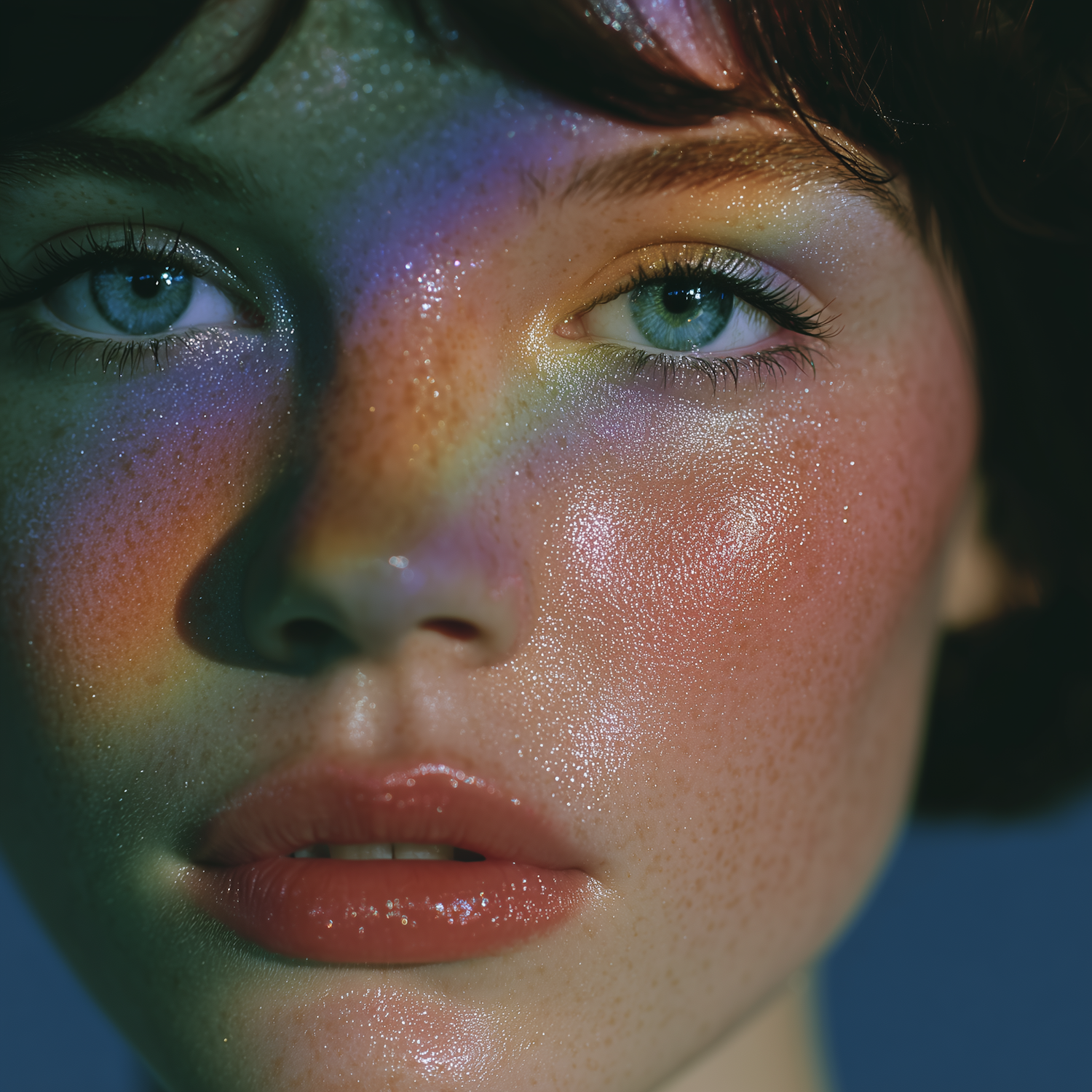 Close-up of a freckled face with rainbow light effects, glossy lips, and blue eyes, creating a vibrant and artistic portrait.