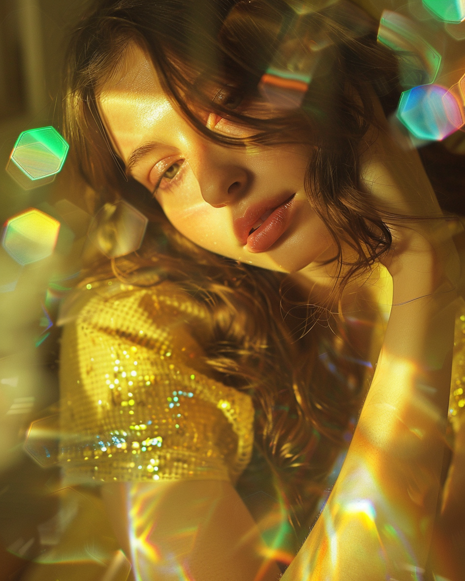 Dreamy portrait of a woman in golden light, with colorful light flares and a shimmering gold outfit creating an ethereal vibe.