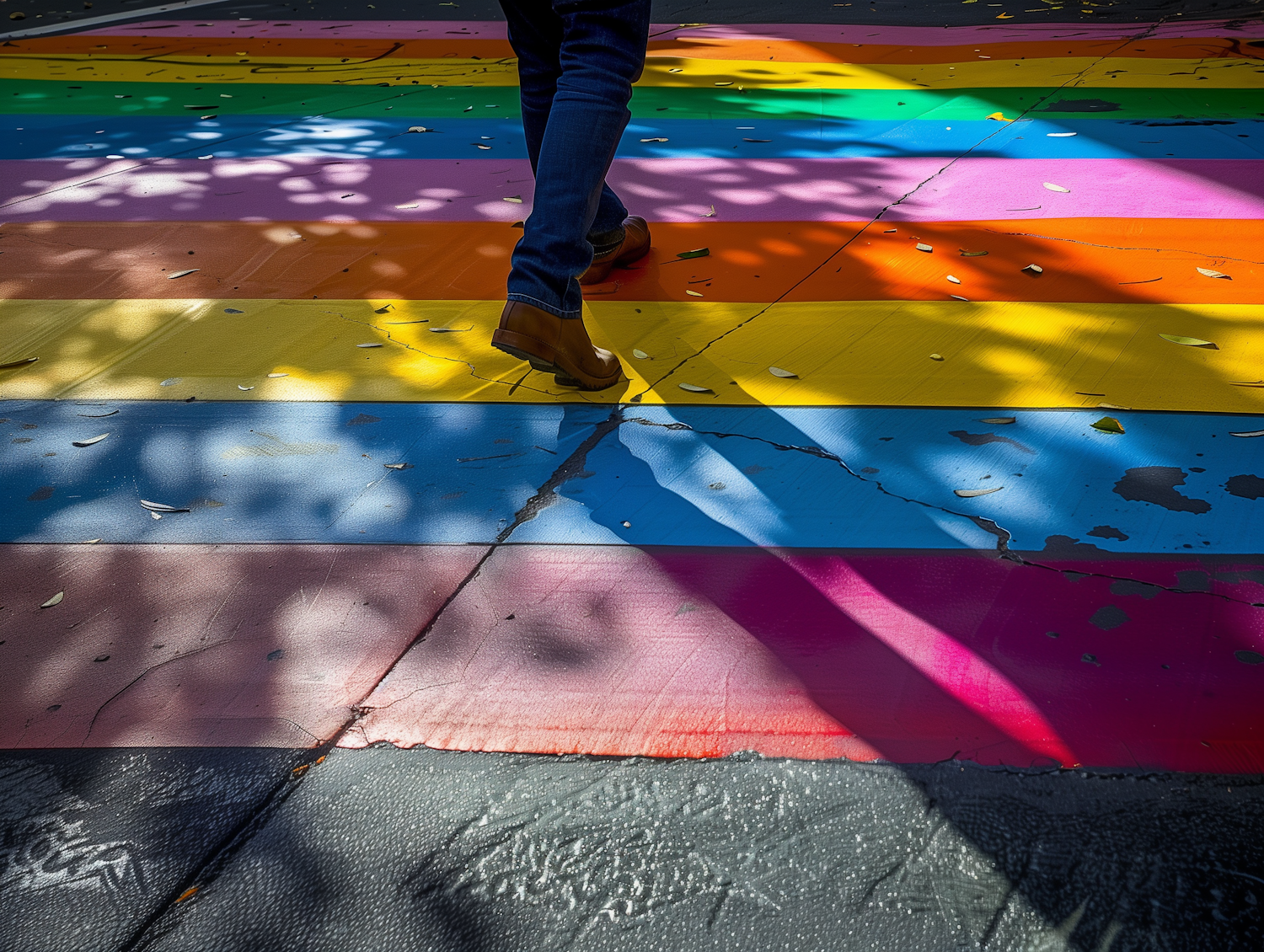 A person walks on a vibrant rainbow crosswalk, casting a shadow. Sunlight and leaves create patterns on the colorful pavement.