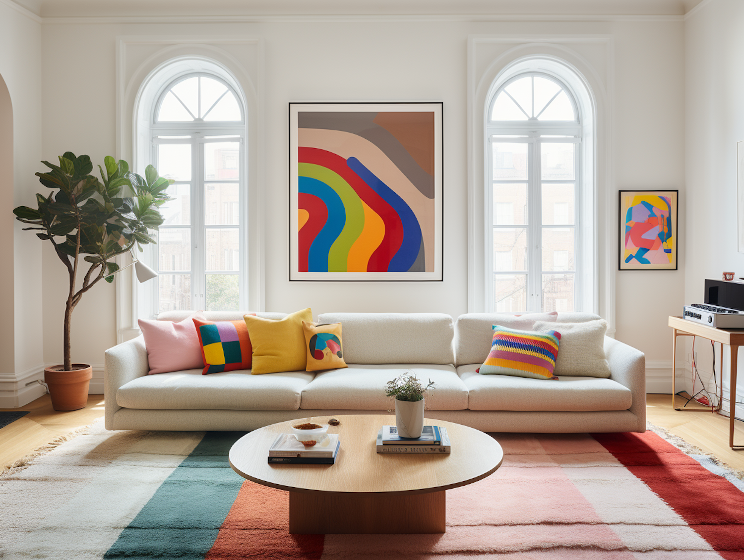 Bright living room with colorful decor, featuring a white sofa, abstract art, and a multicolored rug. Modern and vibrant design.