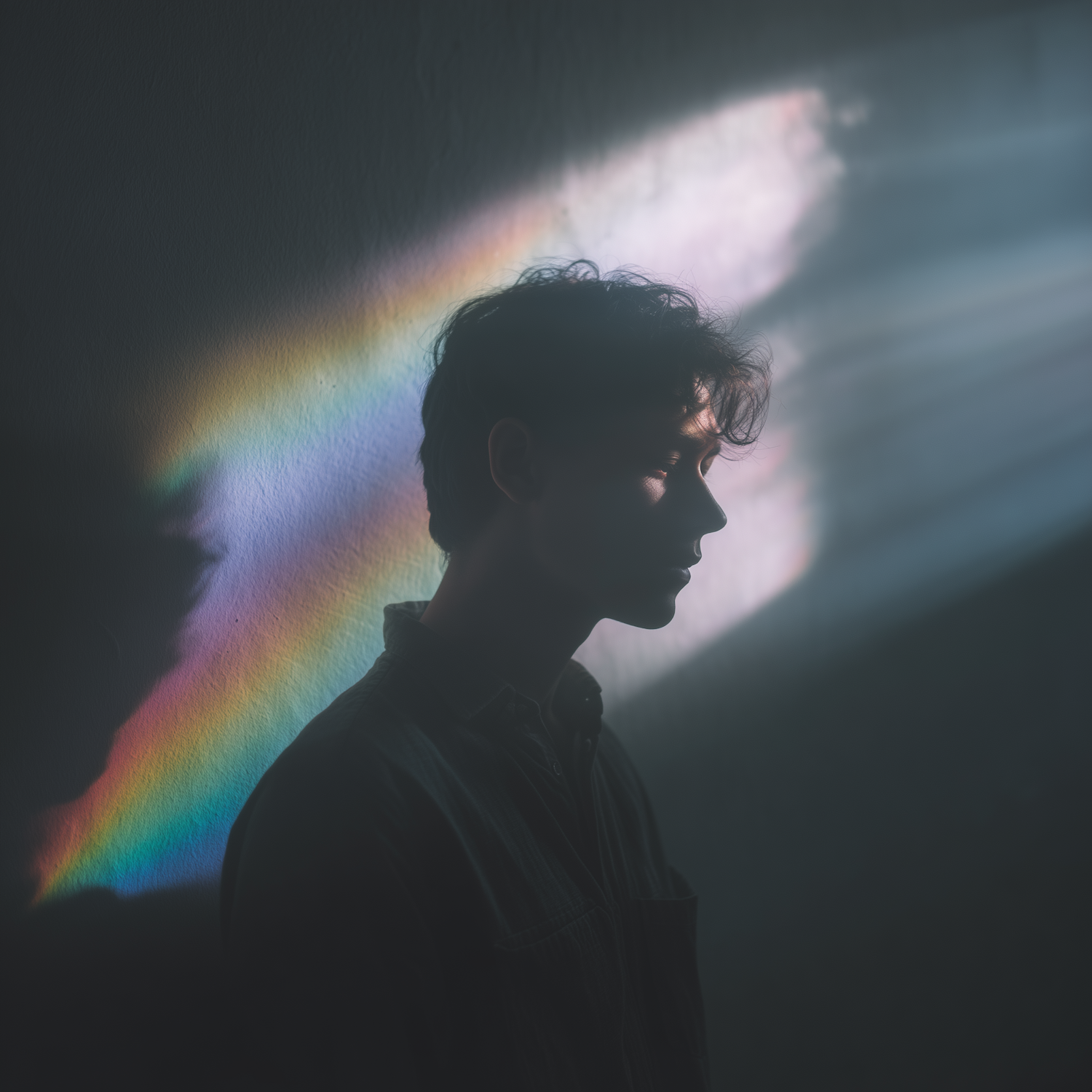 A silhouette of a person with a rainbow light effect on the wall, creating a serene and artistic atmosphere.
