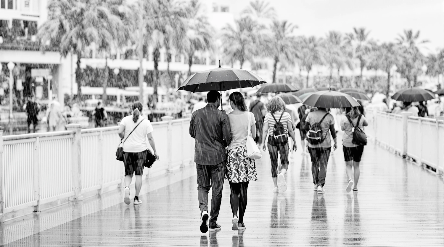 Black and white photo of people walking with umbrellas on a rainy boardwalk, creating a serene and intimate atmosphere.