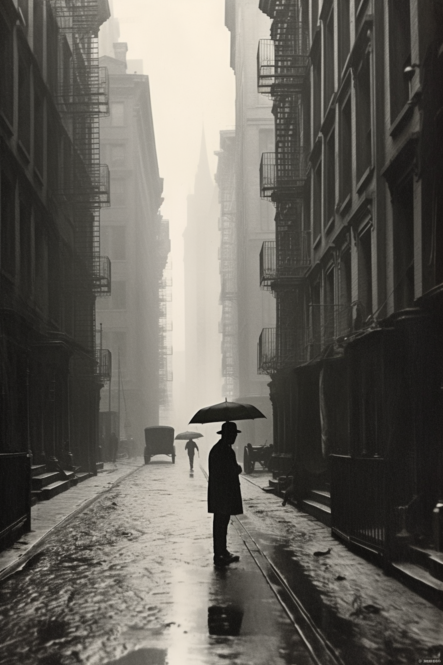 Vintage black and white city street scene with silhouettes, umbrellas, and misty skyline. Reflective wet pavement adds a dramatic touch.