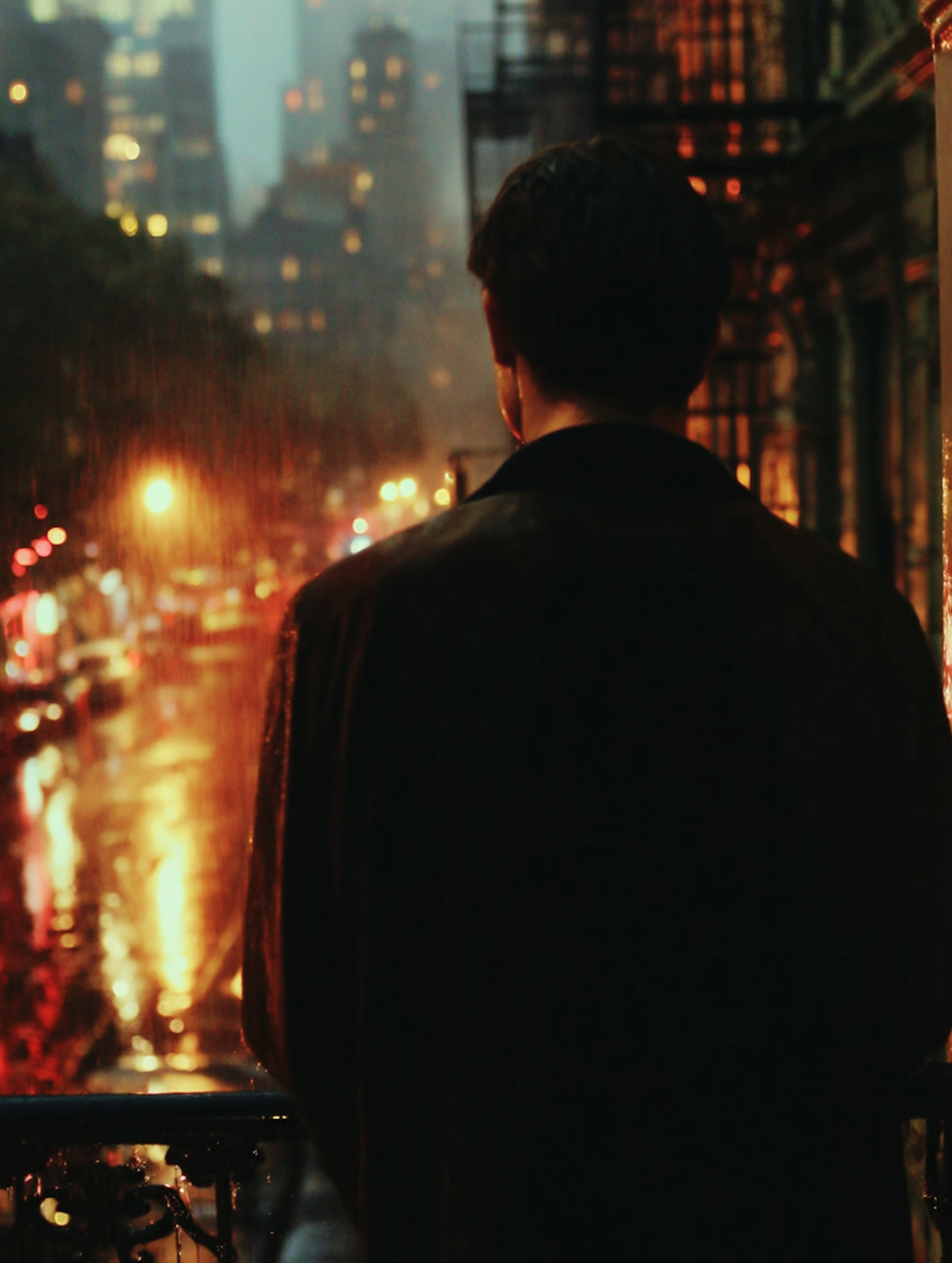A man in a dark coat stands on a balcony, gazing at a rainy city street illuminated by warm streetlights and reflections.