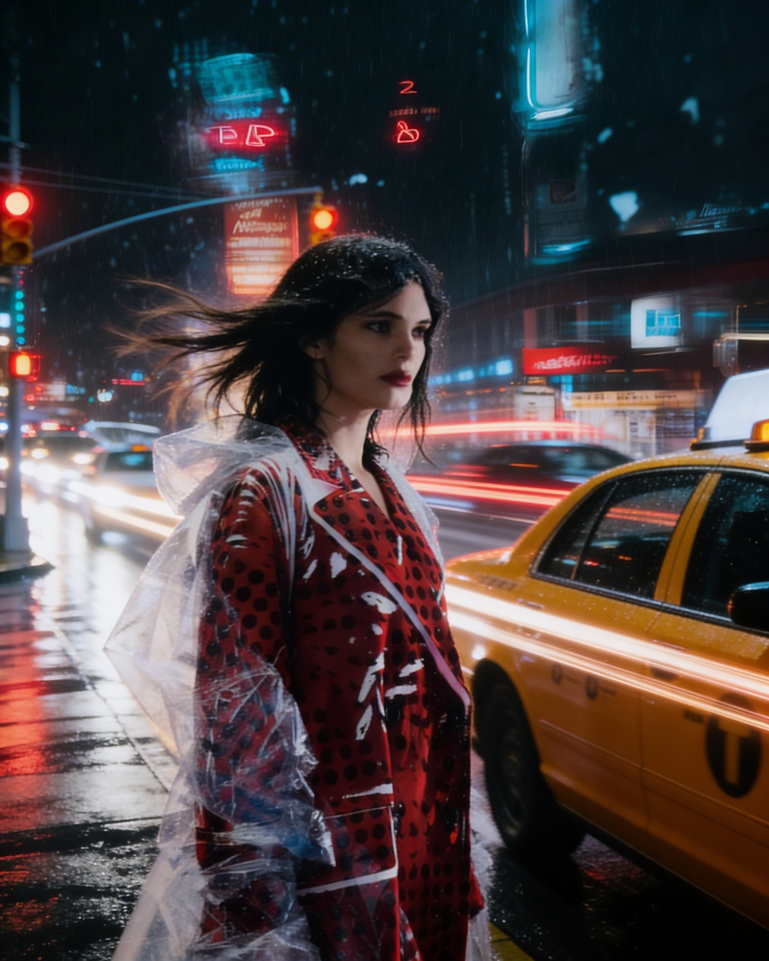 A woman in a red polka-dot dress and clear raincoat stands on a rainy city street at night, with neon lights and a yellow taxi in the background.