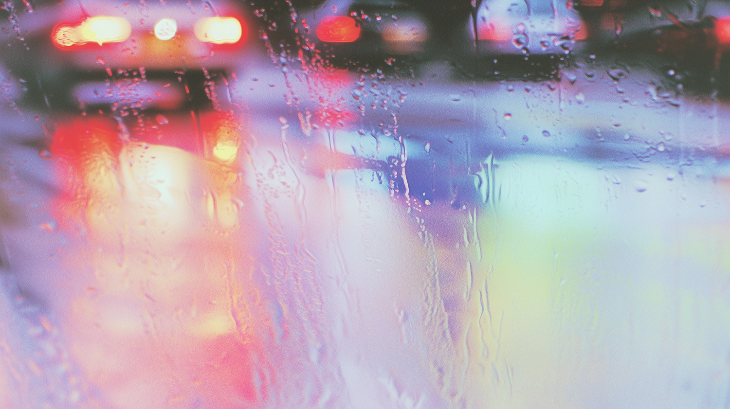 Raindrops on glass with blurred city lights in red, yellow, and blue, creating a dreamy and abstract rainy evening vibe.