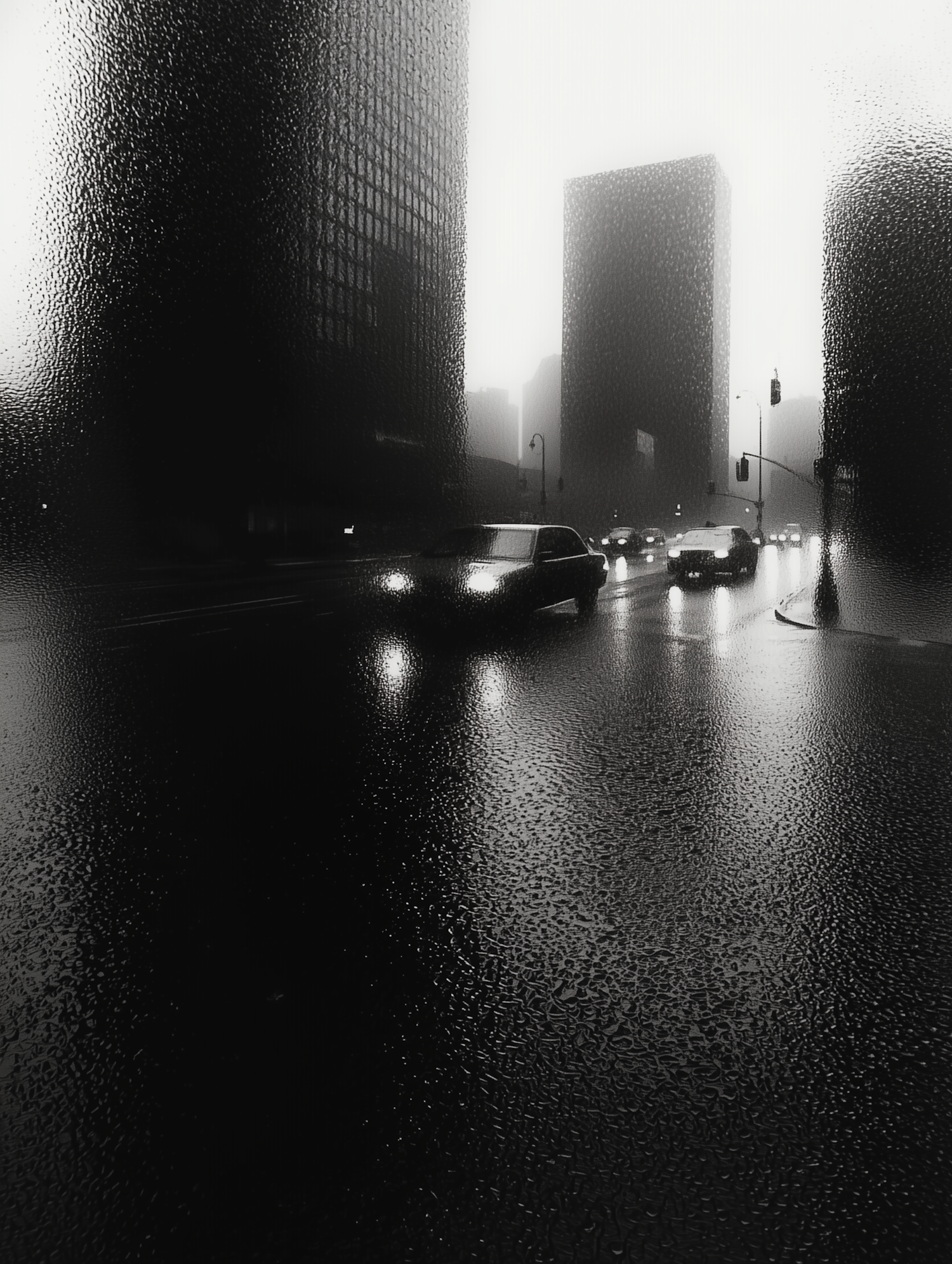 Moody black and white urban scene with cars on a rainy street, skyscrapers in mist, and reflective wet pavement.