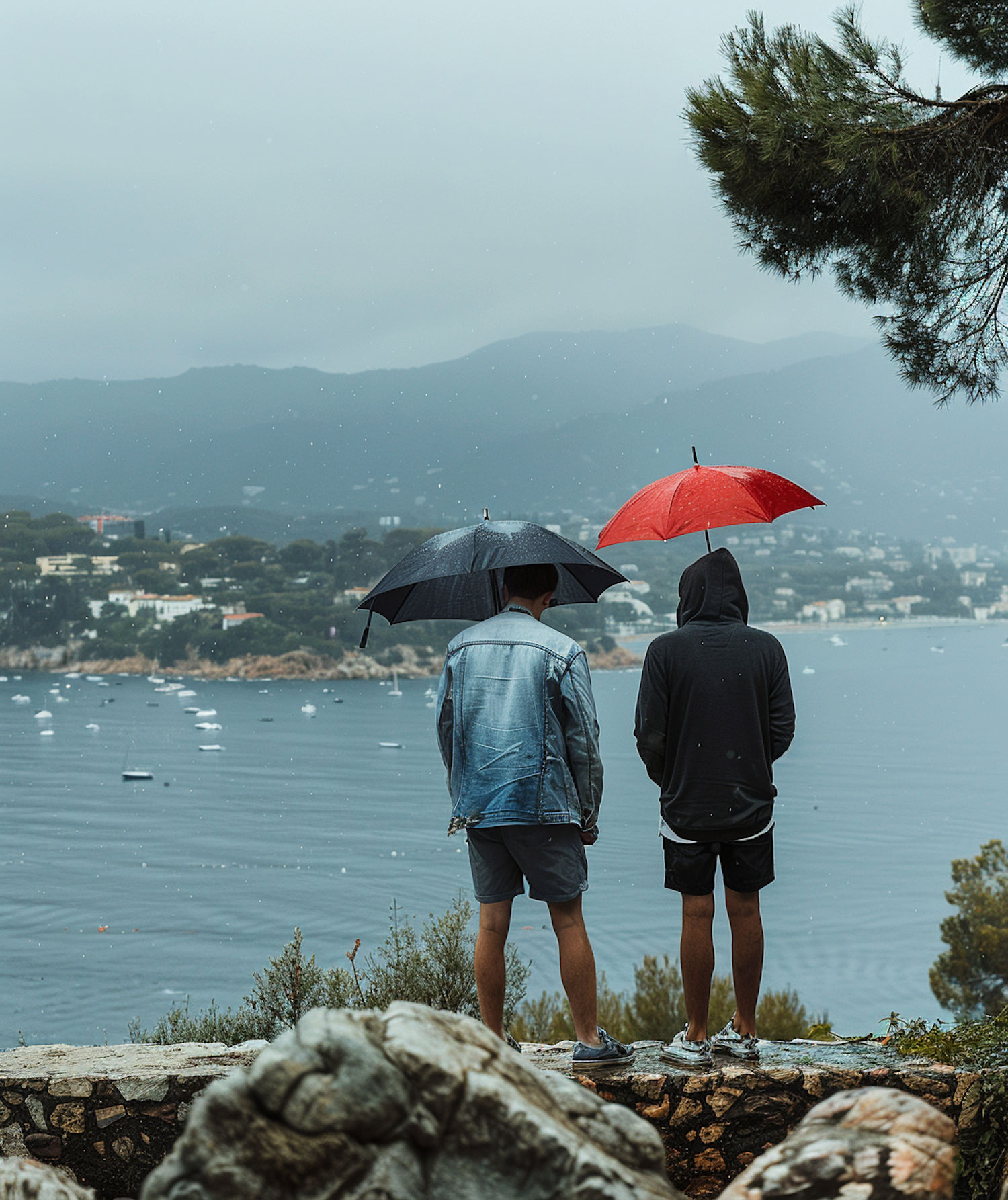 Two people with umbrellas overlook a misty coastal town, creating a serene and contemplative scene.