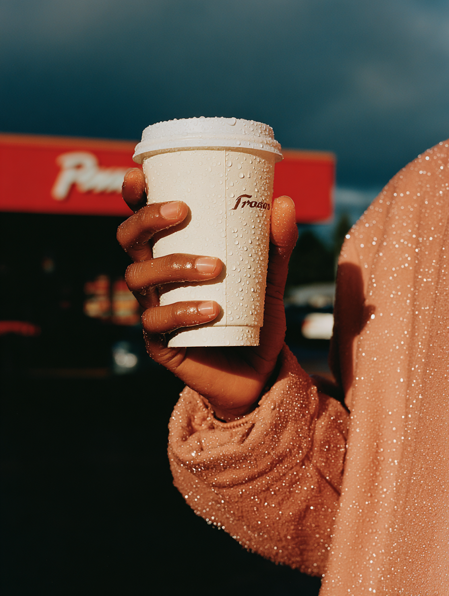 A hand holding a water-dappled coffee cup against a rainy backdrop, with a peach-colored sleeve adding warmth to the scene.