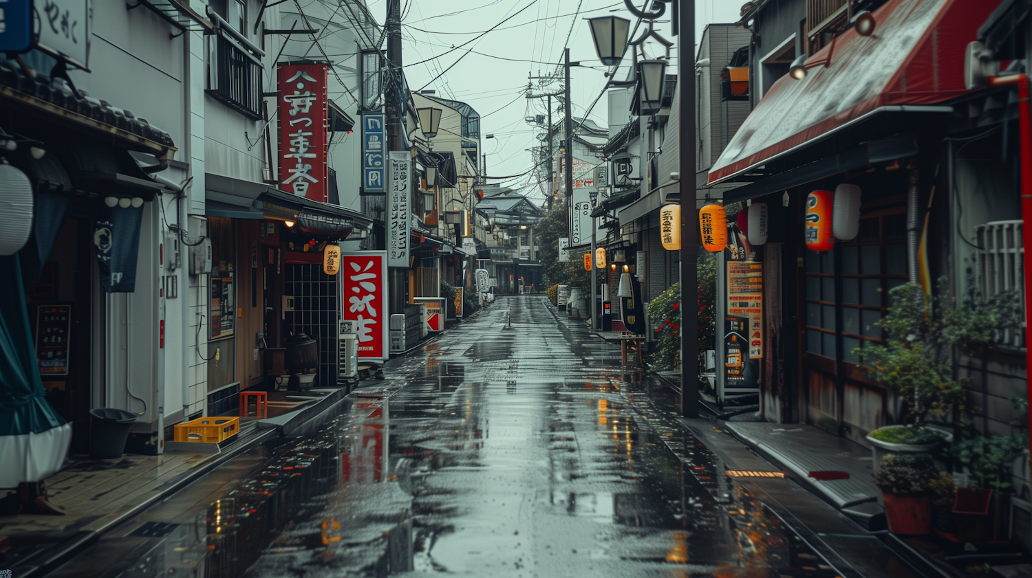 Charming Japanese street with wet pavement, colorful signs, and lanterns. A serene, traditional atmosphere in a quaint setting.