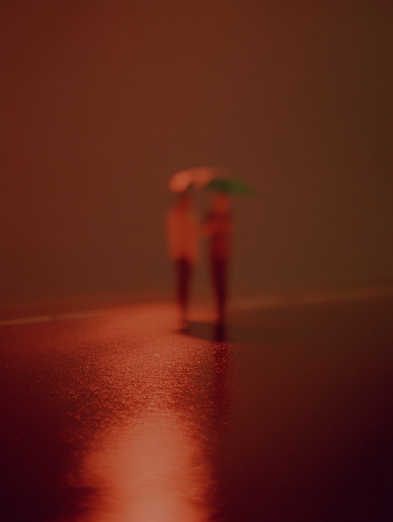A blurred, atmospheric scene of two figures under an umbrella, with warm reddish lighting and reflections on a wet surface.