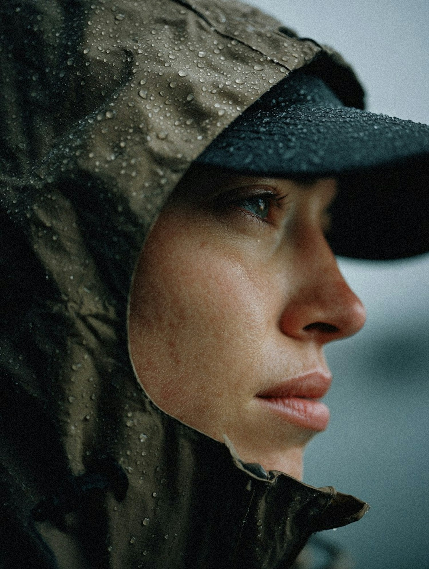 Close-up of a person in a rain jacket and cap, with water droplets on the fabric, gazing into the distance in a serene outdoor setting.