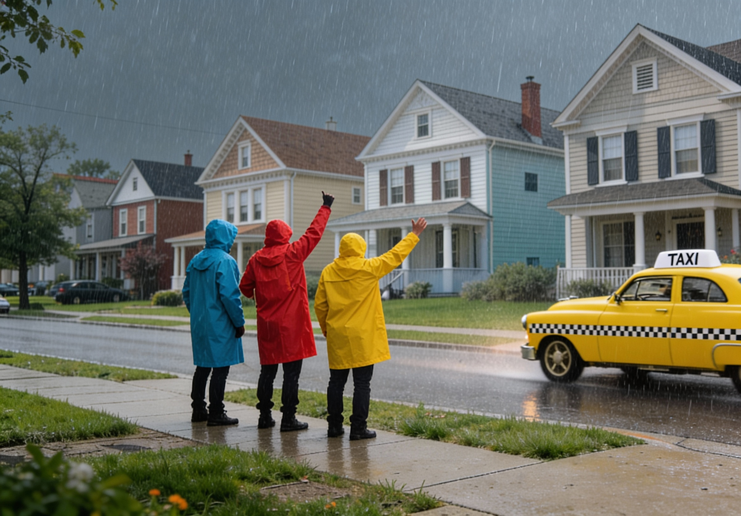 Three people in colorful raincoats hail a yellow taxi on a rainy day in a charming residential neighborhood.