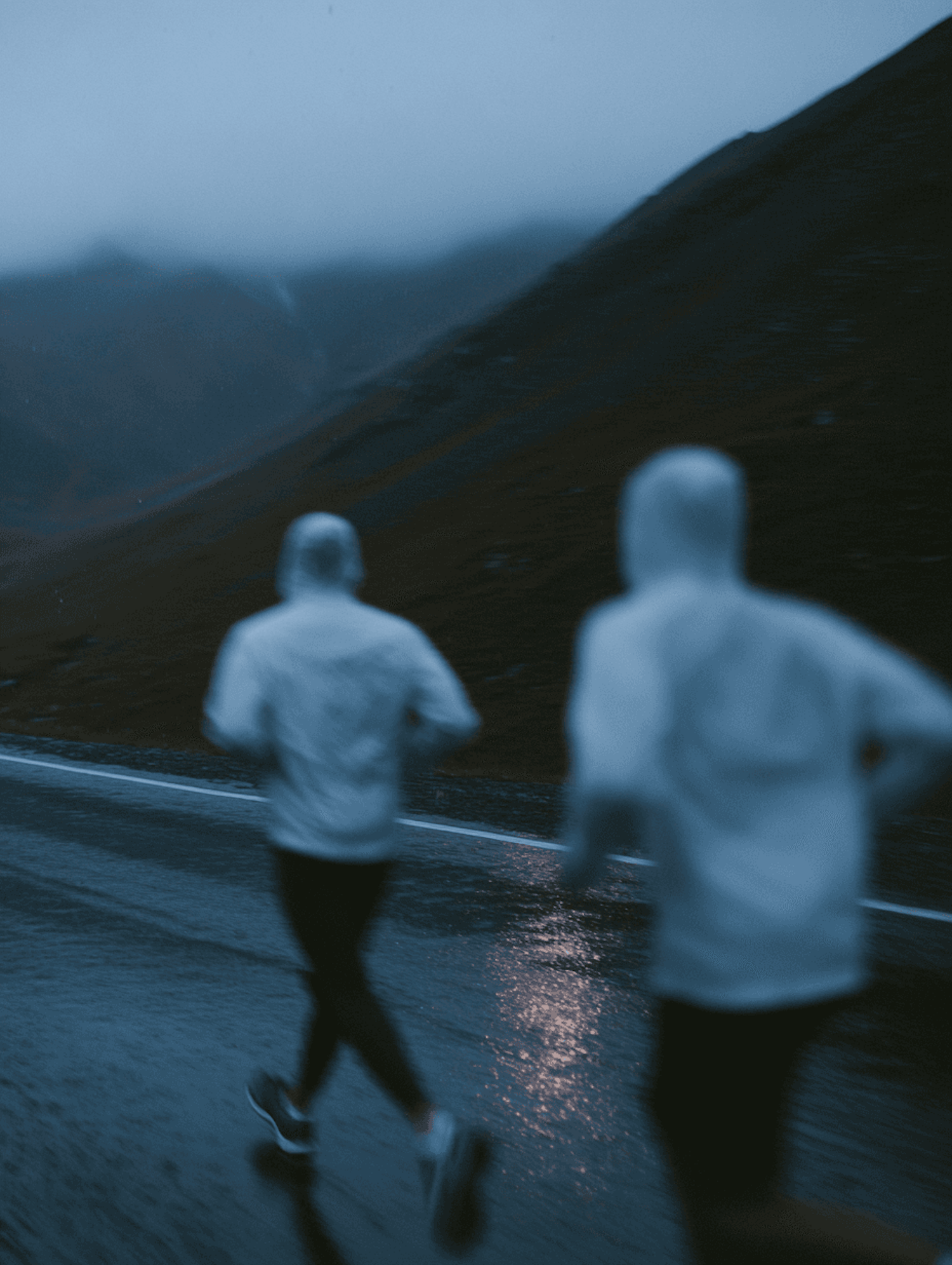 Two runners in hooded jackets jog on a wet road during a rainy evening, with a misty mountainous backdrop creating a serene atmosphere.