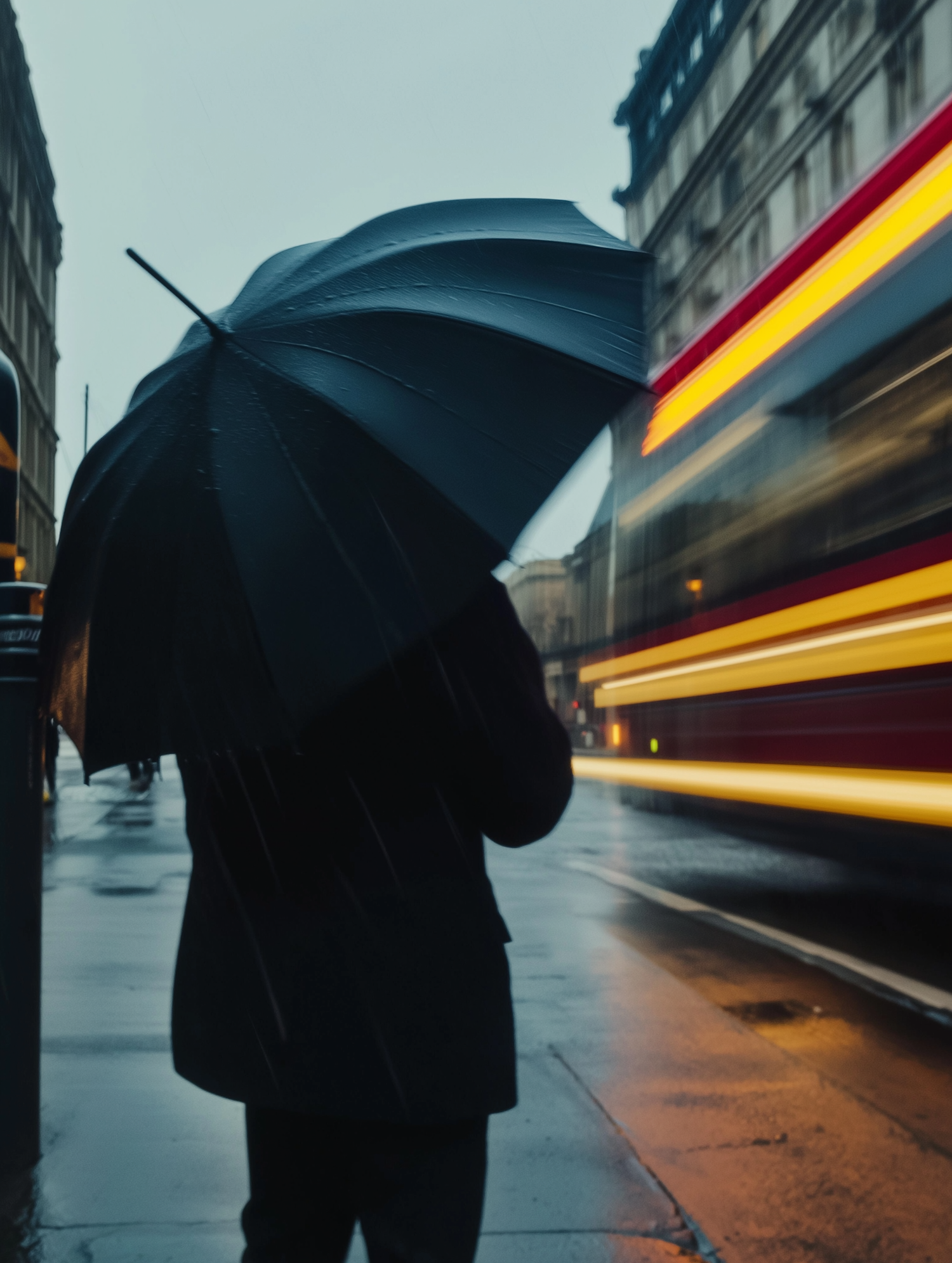 Rainy city evening with a person holding a black umbrella as a bus streaks by, creating a dynamic urban scene with moody reflections.