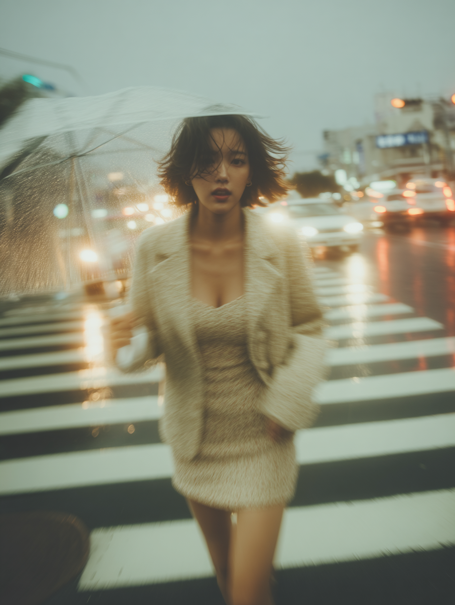 A woman walks across a rainy city street with a transparent umbrella, wearing a beige outfit, against a backdrop of blurred car lights.