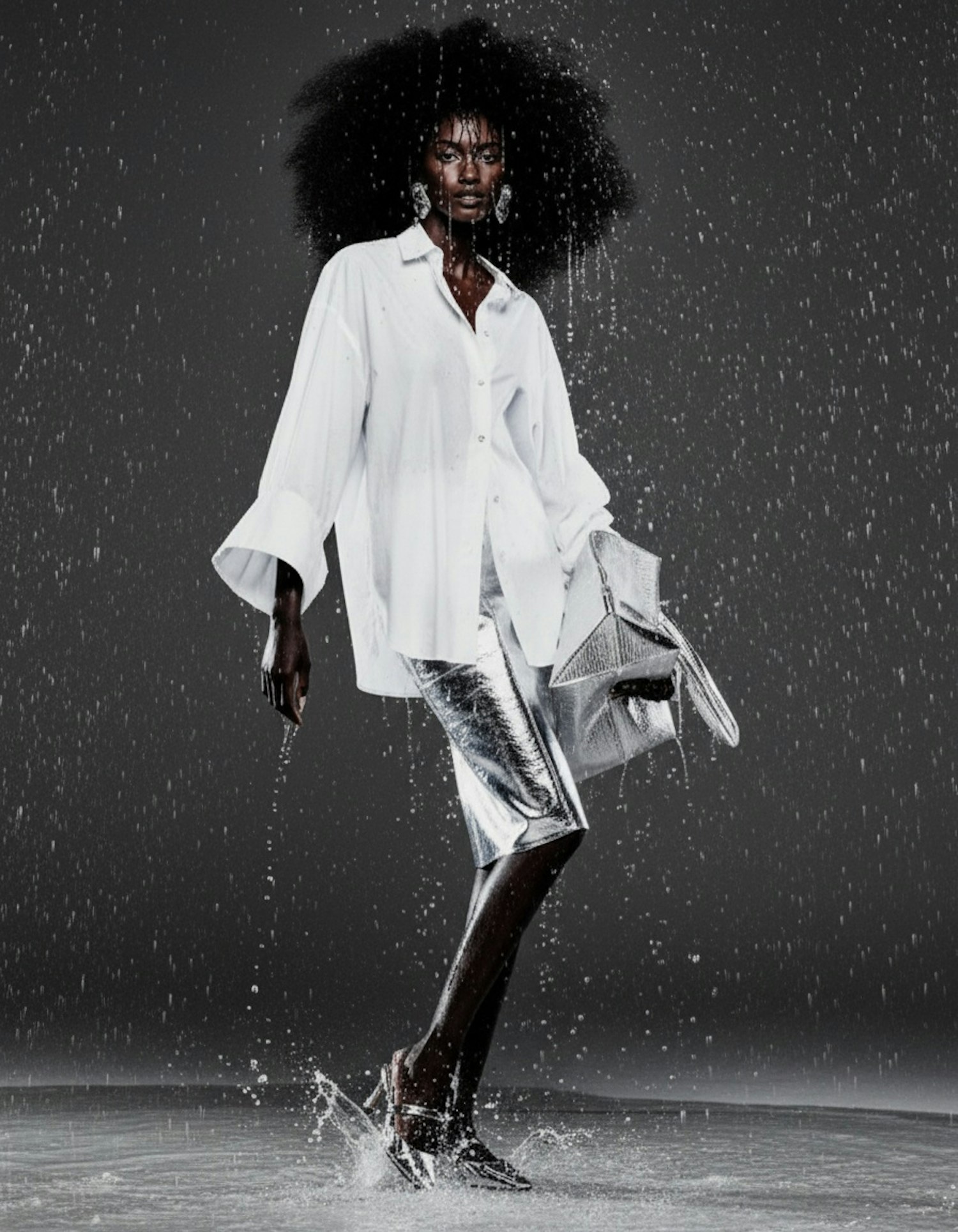 A model in a white shirt and silver skirt poses under simulated rain, showcasing dynamic fashion and dramatic lighting.