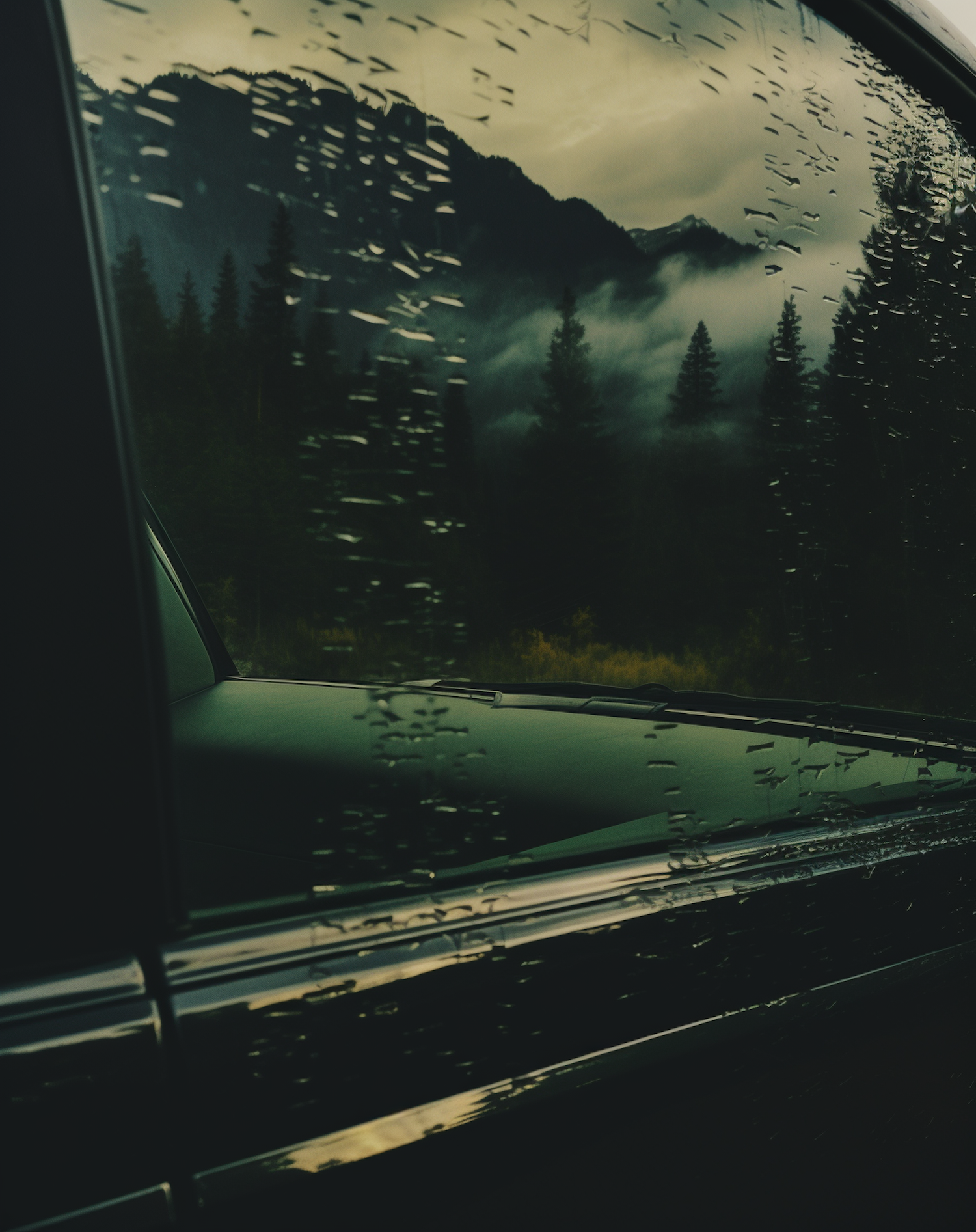 Raindrops on a car window reveal a misty mountain landscape with pine trees and clouds, creating a serene and mysterious atmosphere.