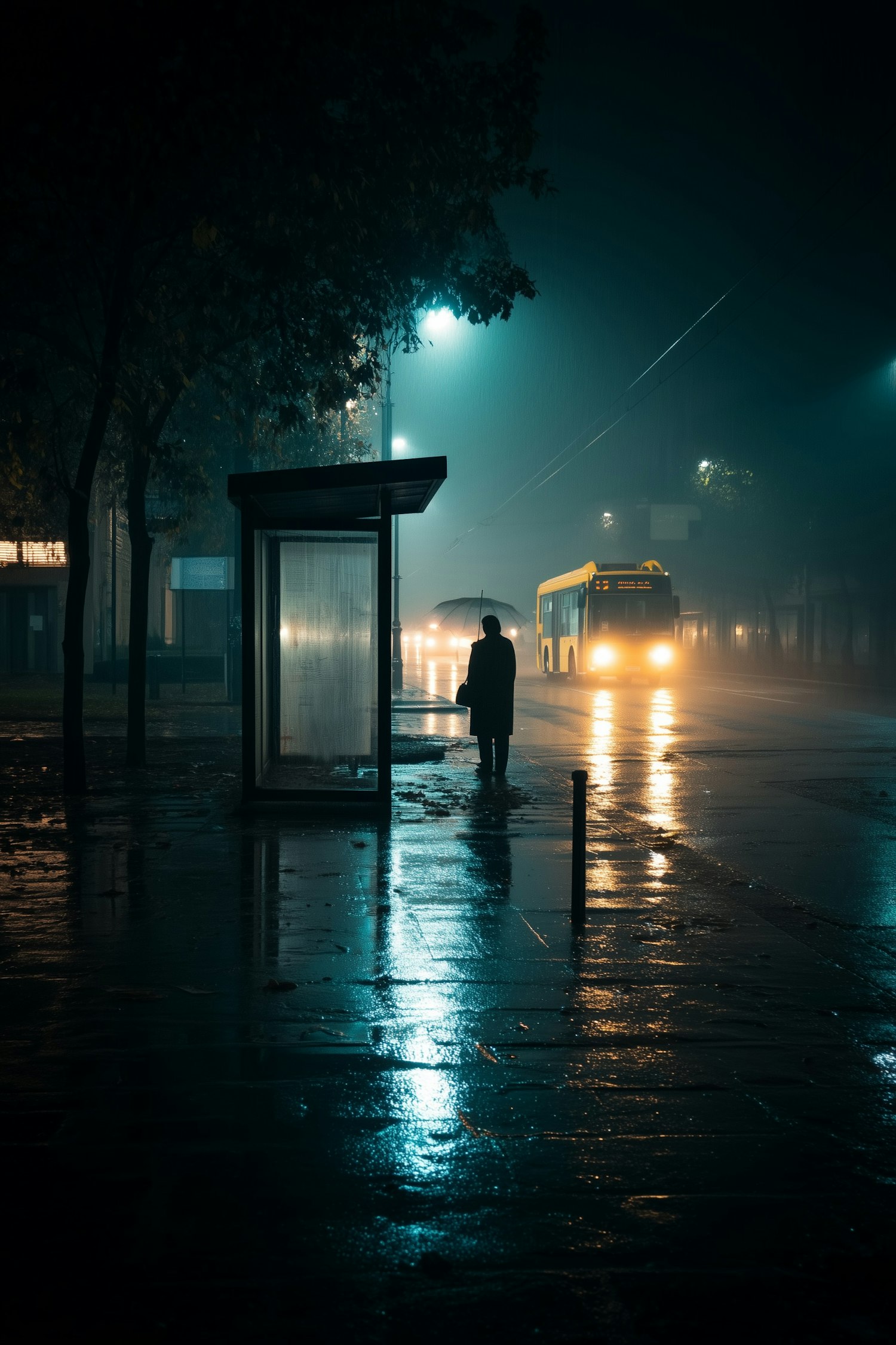 Moody nighttime scene of a rainy street with a lone figure at a bus stop and a yellow bus approaching through the mist.