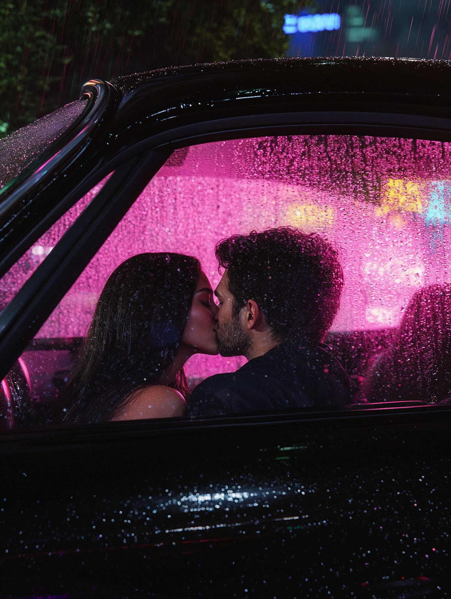 A couple shares a kiss inside a car on a rainy night, with neon pink lights glowing through the raindrop-covered window.