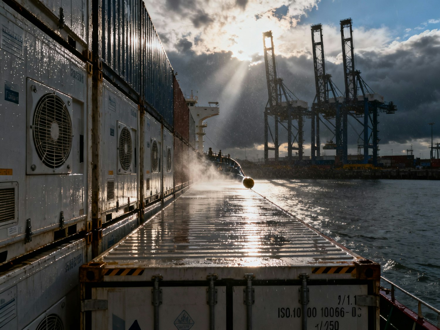 Industrial harbor right after rainfall, close bow quarter with stacked reefers visible (no brands), vent grilles detailed; cranes framed in background; rifts in storm clouds yielding thin beams grazing wet hull plates; faint fender spray captured mid-air. 24 mm, f/7.1, ISO 100, 1/250 s; CPL—deepen sky, keep reflections realistic. Negative: haze, haloing, over-clarity, metallic color drift.