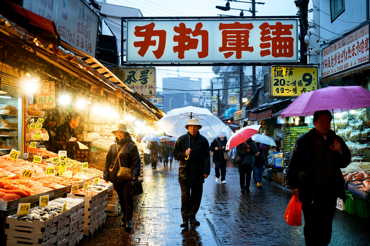 A vibrant street market on a rainy day, with people under umbrellas browsing brightly lit stalls filled with fresh seafood and produce.