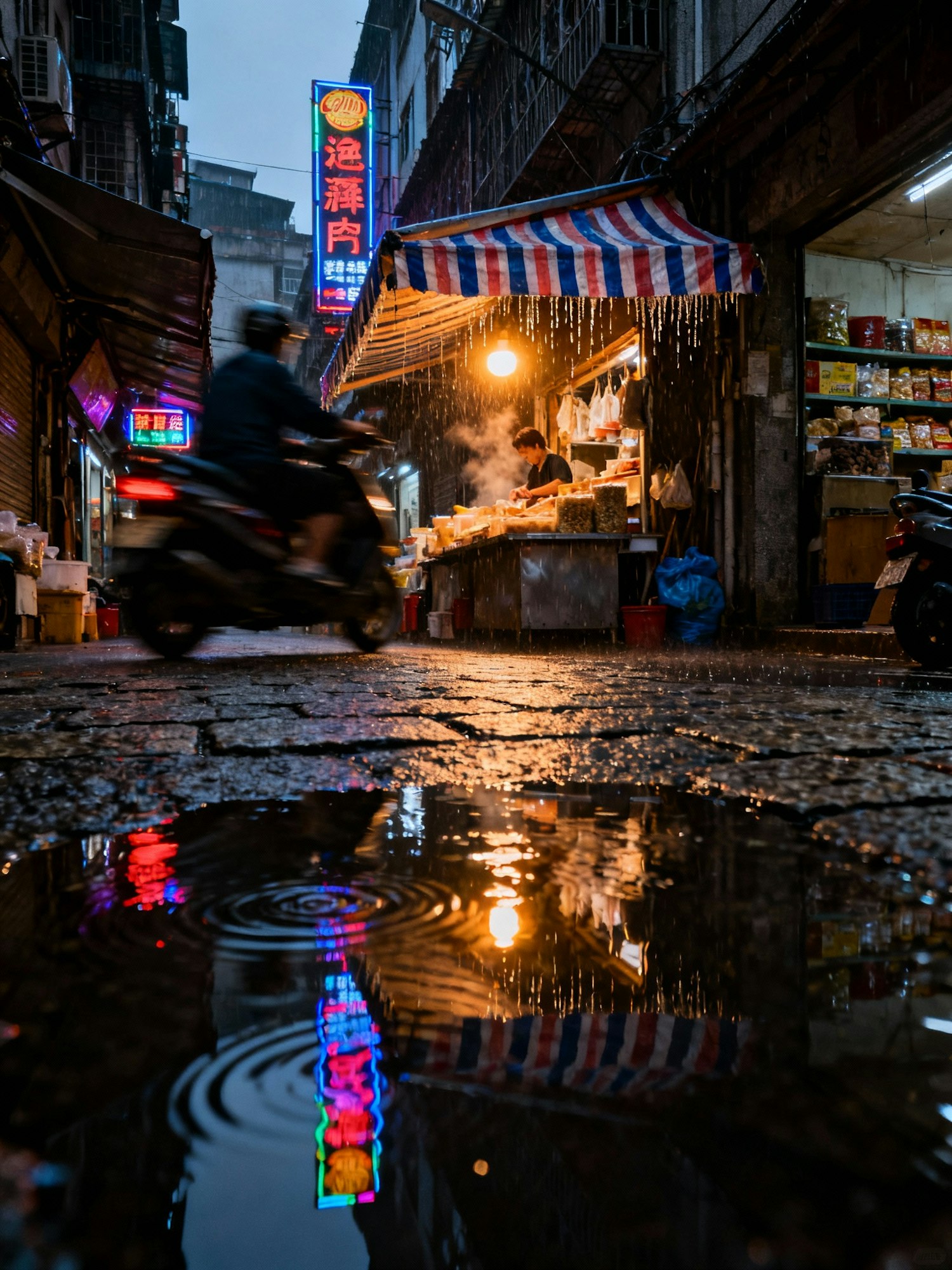 Rainy Asian market street, striped awnings dripping, motorbike passing fast and blurred, street vendor under warm tungsten bulb, foreground puddle capturing sign reflections; narrow perspective between buildings. 35 mm, 1/15 s with micro-pan on motorbike, f/2.8, ISO 2000, WB 3600 K; small off-camera flash to freeze puddle ripple. Negative: plastic skin, fake steam, packaged brand logos.