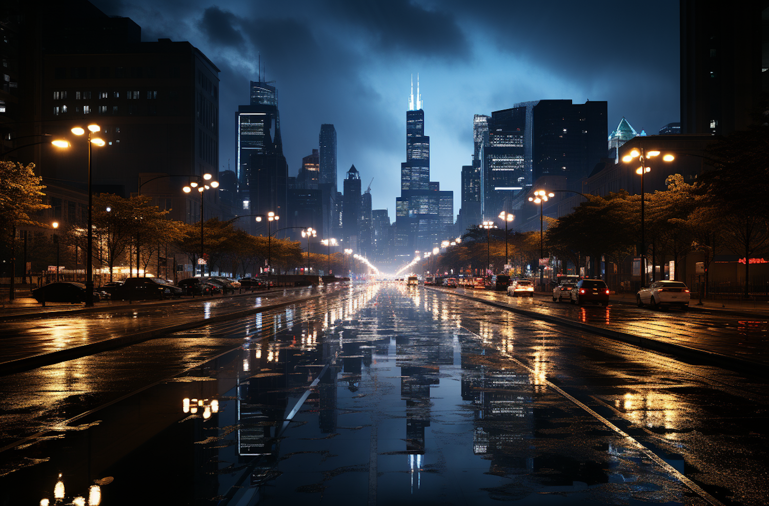 Rainy city street at night with glowing streetlights, skyscrapers, and reflections on wet pavement creating a cinematic urban vibe.