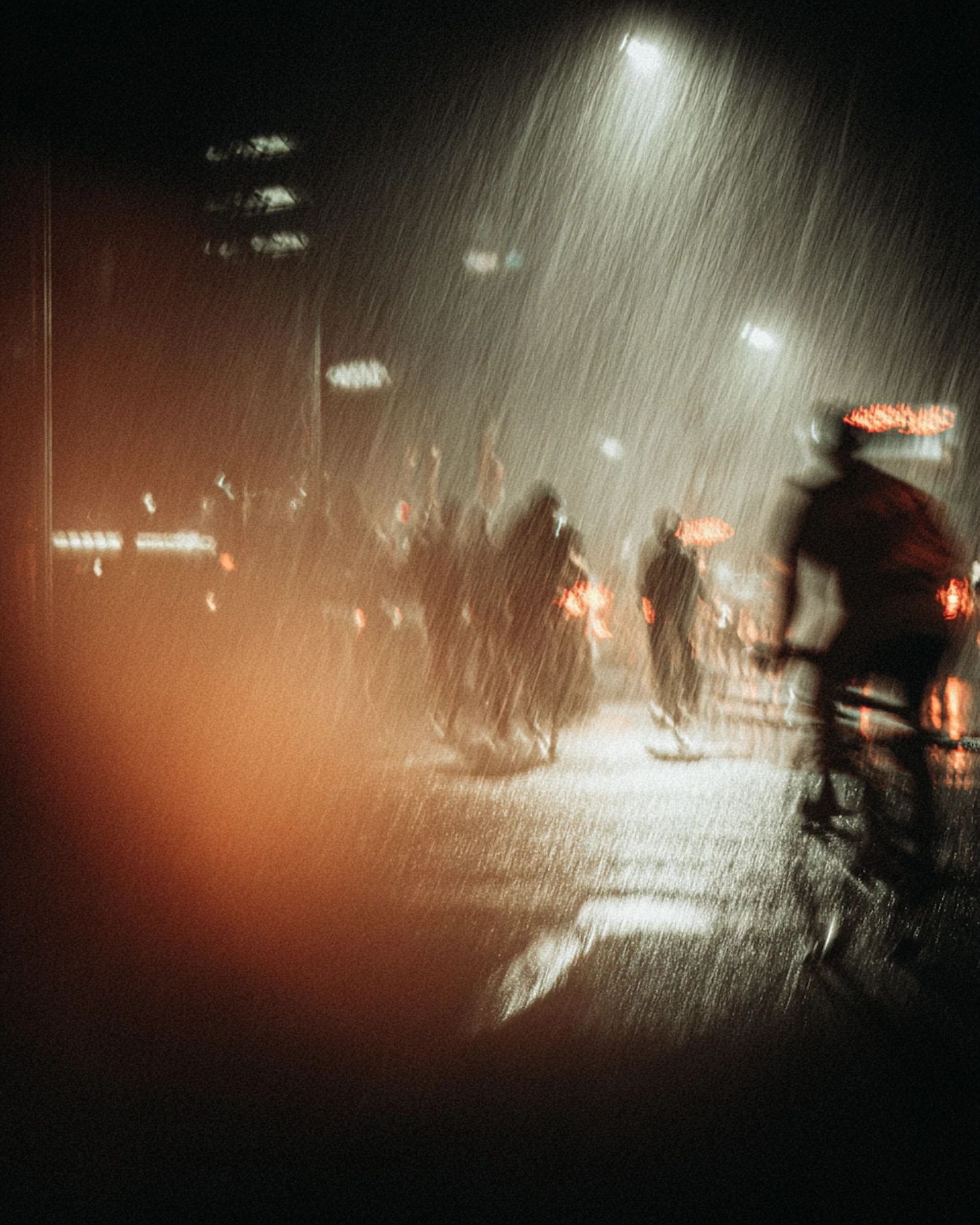 A rainy night scene with blurred figures and cyclists under streetlights, creating a moody and dynamic urban atmosphere.