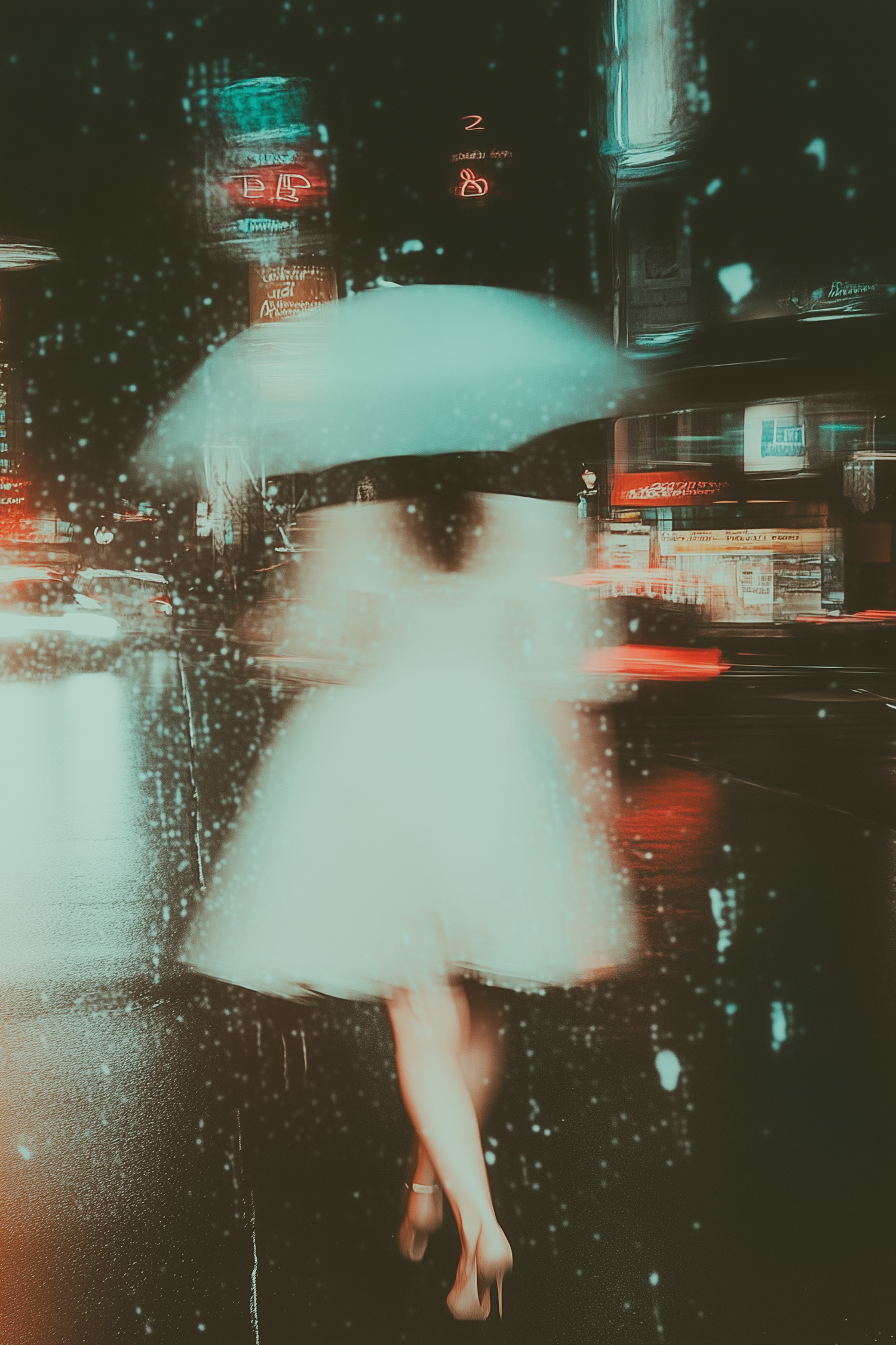 Blurred figure with umbrella in a rainy city at night, neon lights and reflections create a dreamy, cinematic urban vibe.