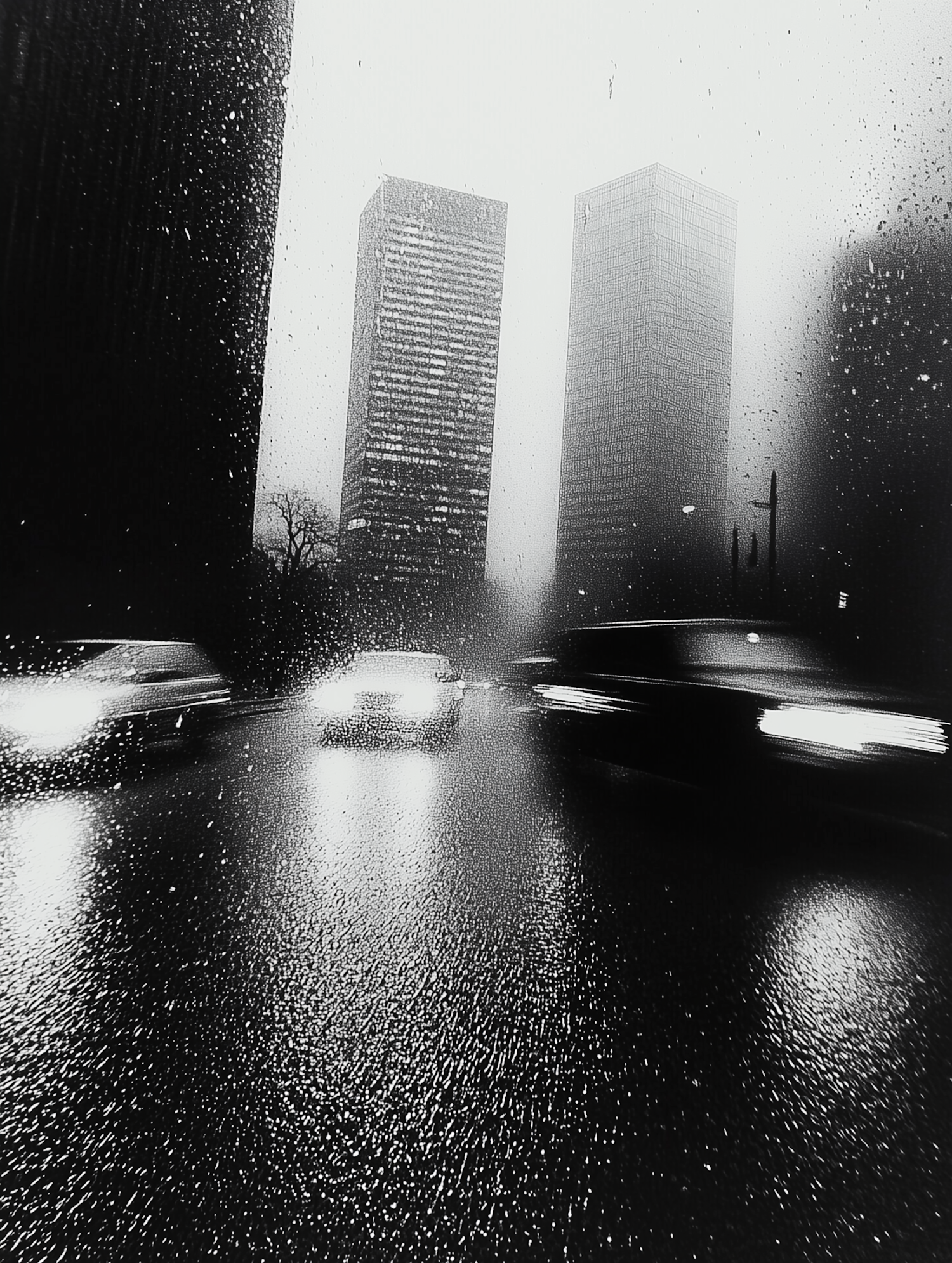Moody black and white cityscape with skyscrapers, rain, and blurred car lights reflecting on a wet road.