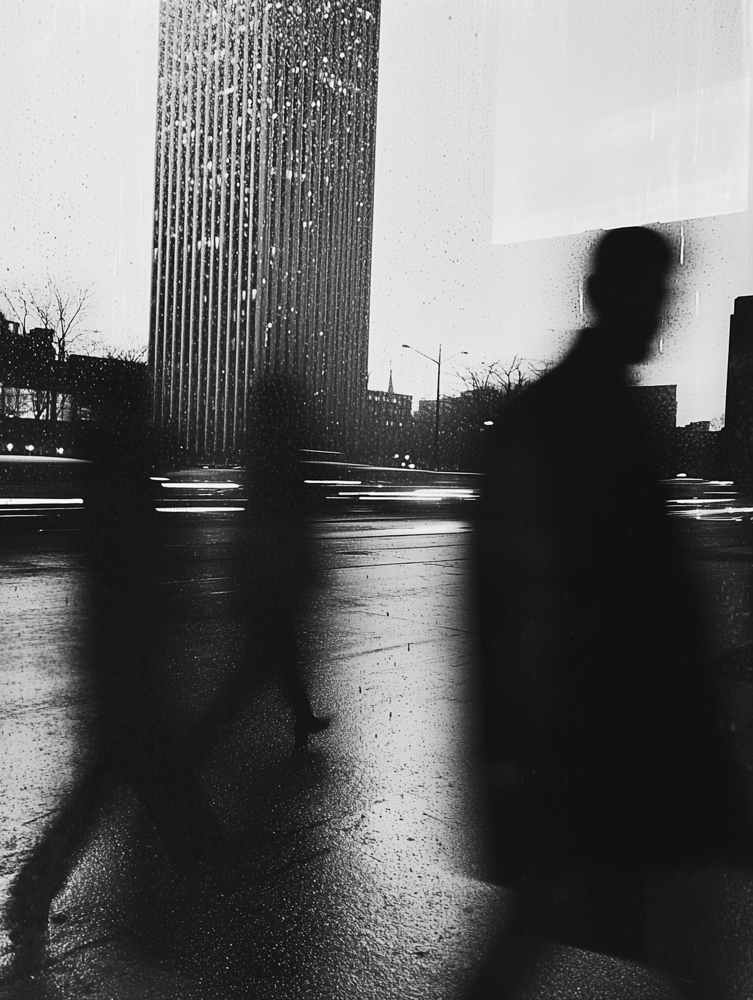 Black and white urban scene with blurred silhouettes walking in rain, reflecting light on wet street, and a tall building in the background.