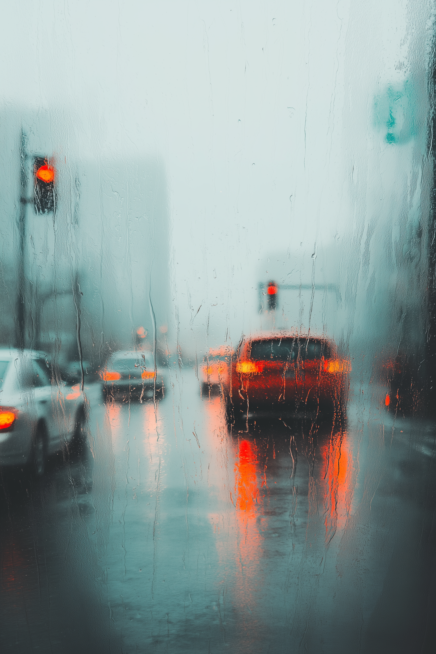Rainy city street view through a window with blurred cars and glowing red taillights, creating a moody urban atmosphere.