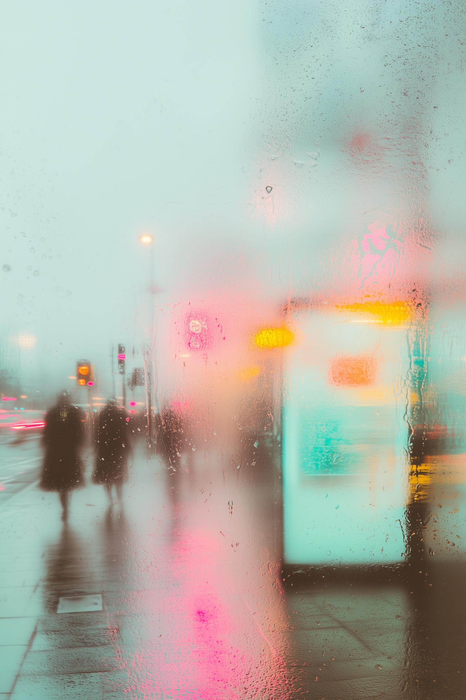 Rainy cityscape through fogged glass, with blurred neon lights and silhouettes of pedestrians on a wet sidewalk.