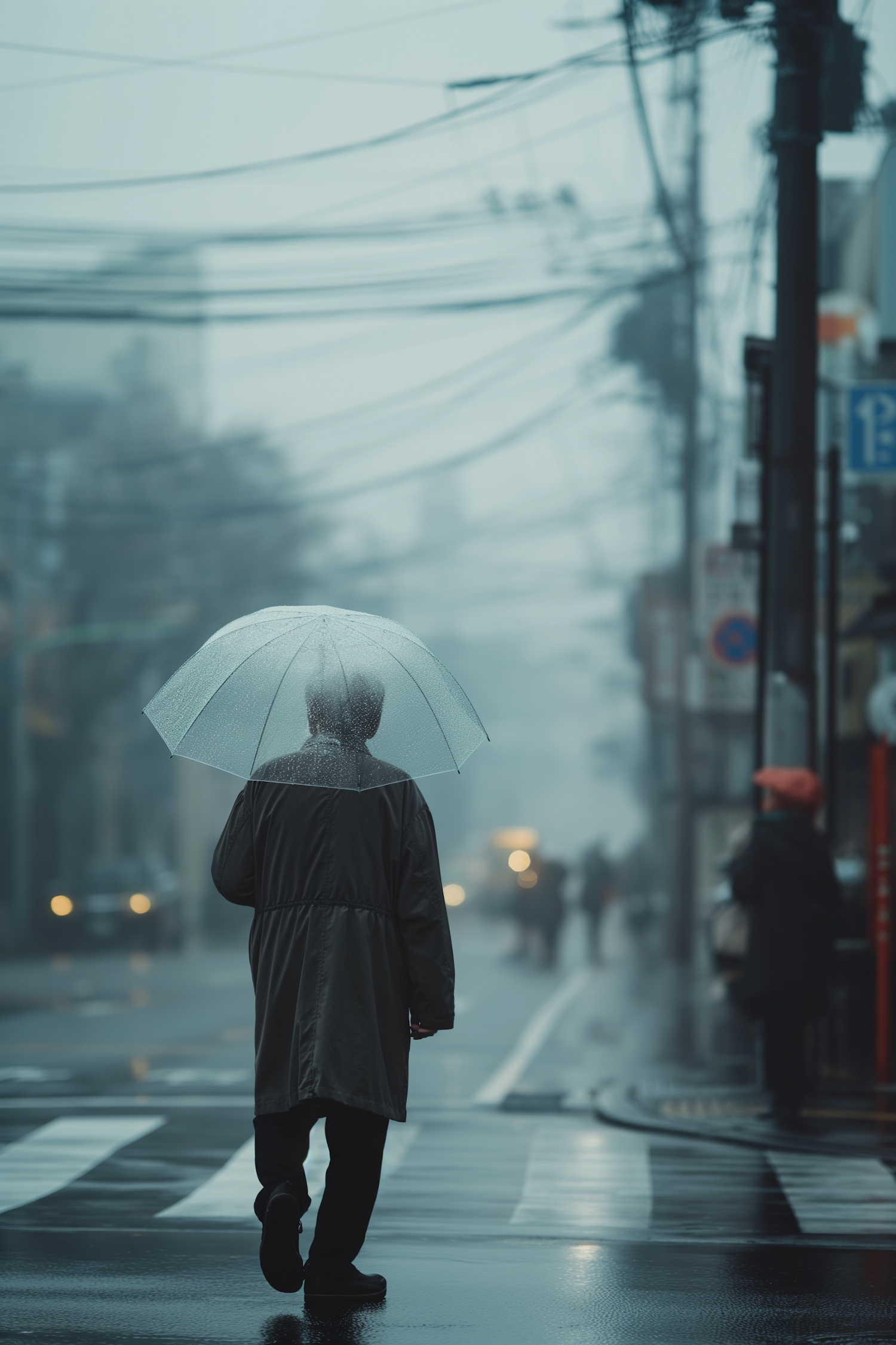 A person with an umbrella walks on a rainy city street, surrounded by mist and blurred figures, creating a serene urban atmosphere.
