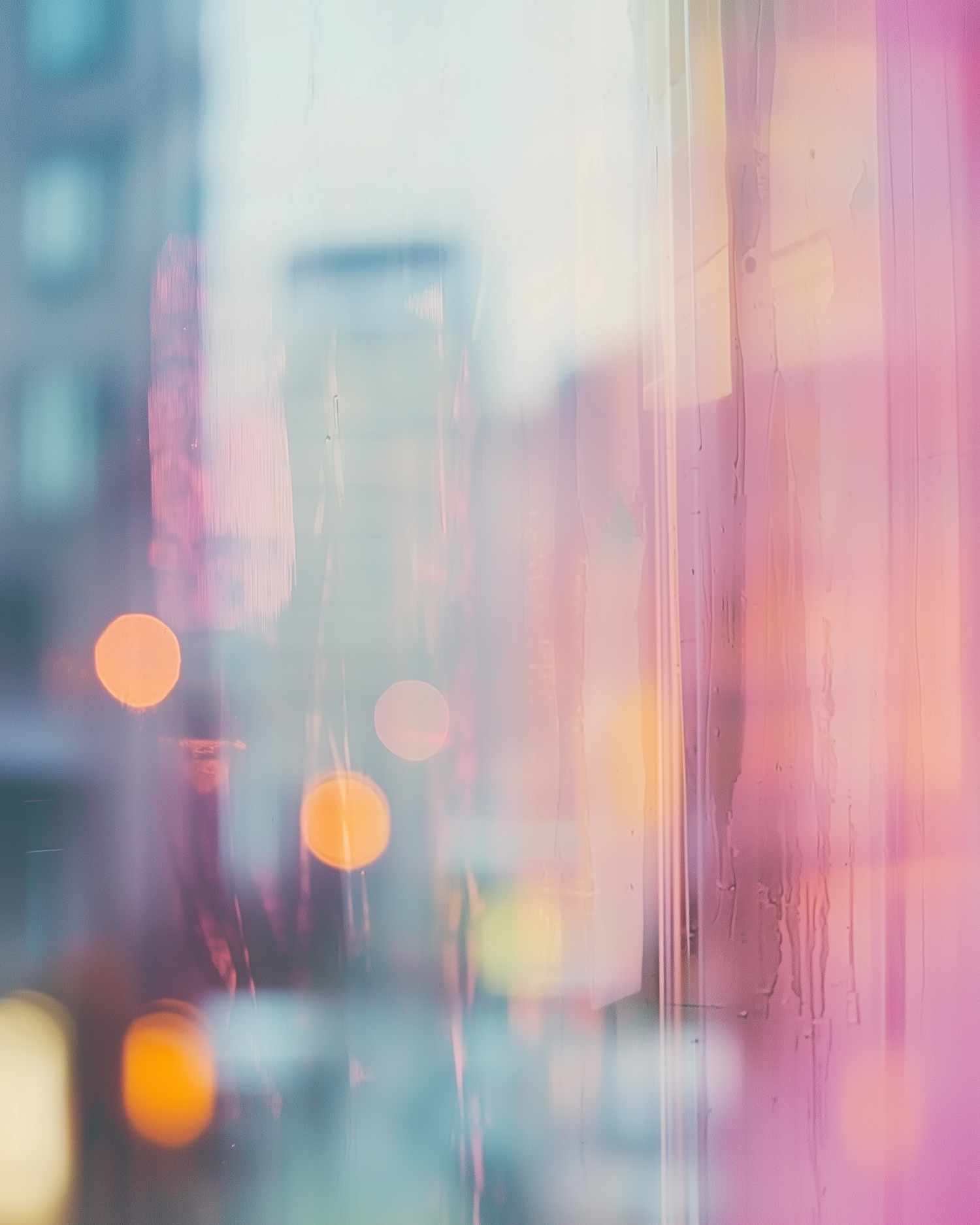 Abstract view of rain-streaked glass with blurred city lights in pastel hues, creating a dreamy and textured urban aesthetic.