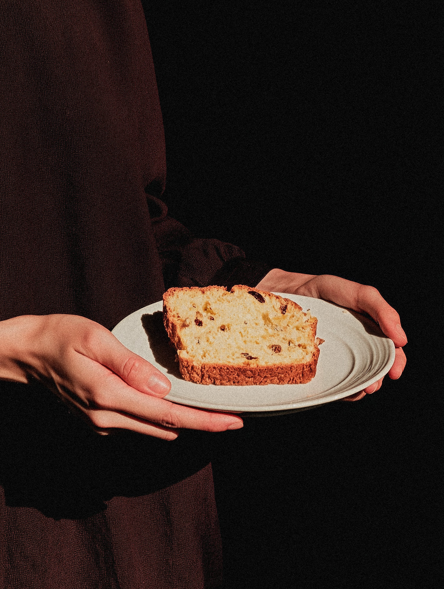 A close-up of hands holding a plate with a slice of raisin bread, set against a dark background for a minimalist aesthetic.