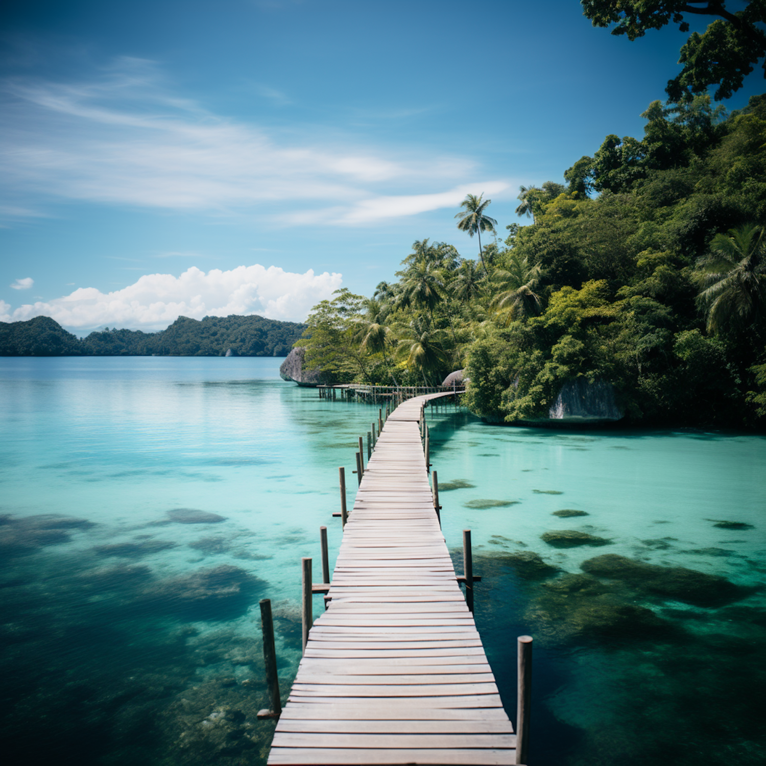 A tranquil wooden pier stretches over turquoise waters to a lush island, under a vibrant blue sky with scattered clouds.
