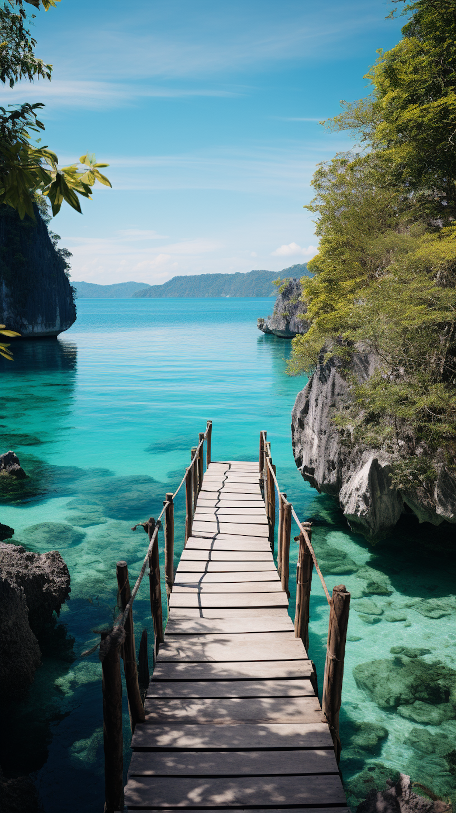 Wooden pier over turquoise waters with lush greenery and distant hills under a clear blue sky, creating a serene and inviting scene.