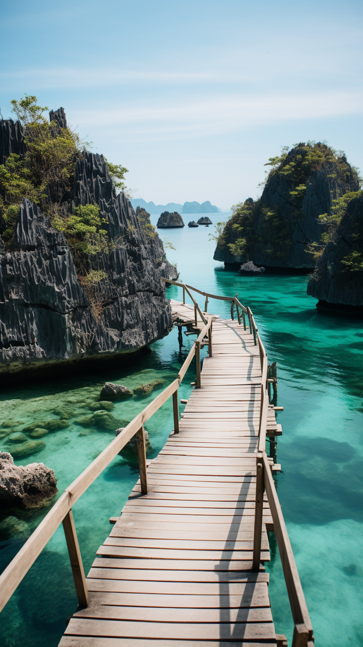 Scenic wooden walkway over turquoise waters with limestone cliffs and clear skies, perfect for adventure and exploration.