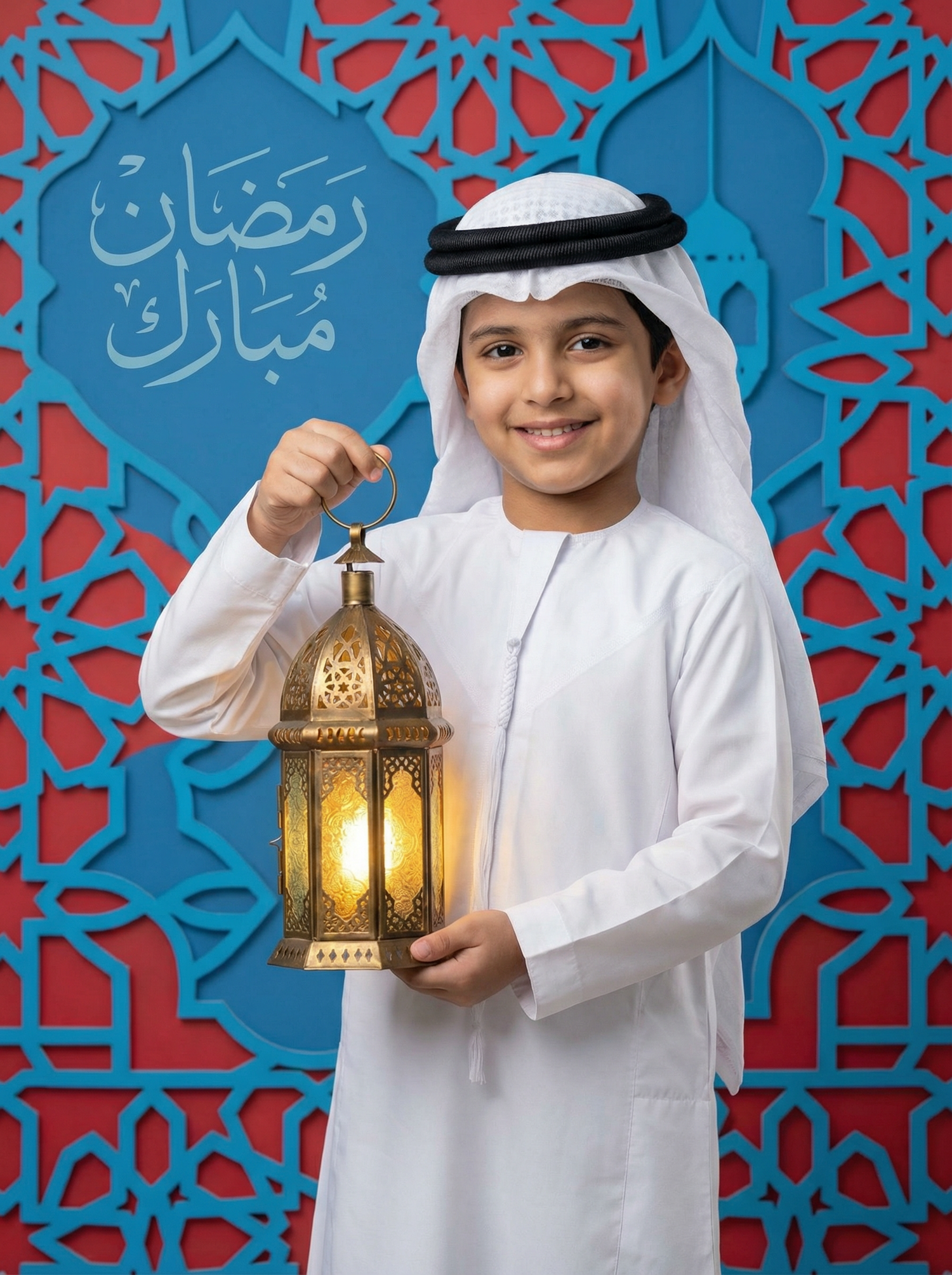 A smiling boy in traditional attire holds a glowing lantern against a vibrant geometric background with 'Ramadan Mubarak' in Arabic.