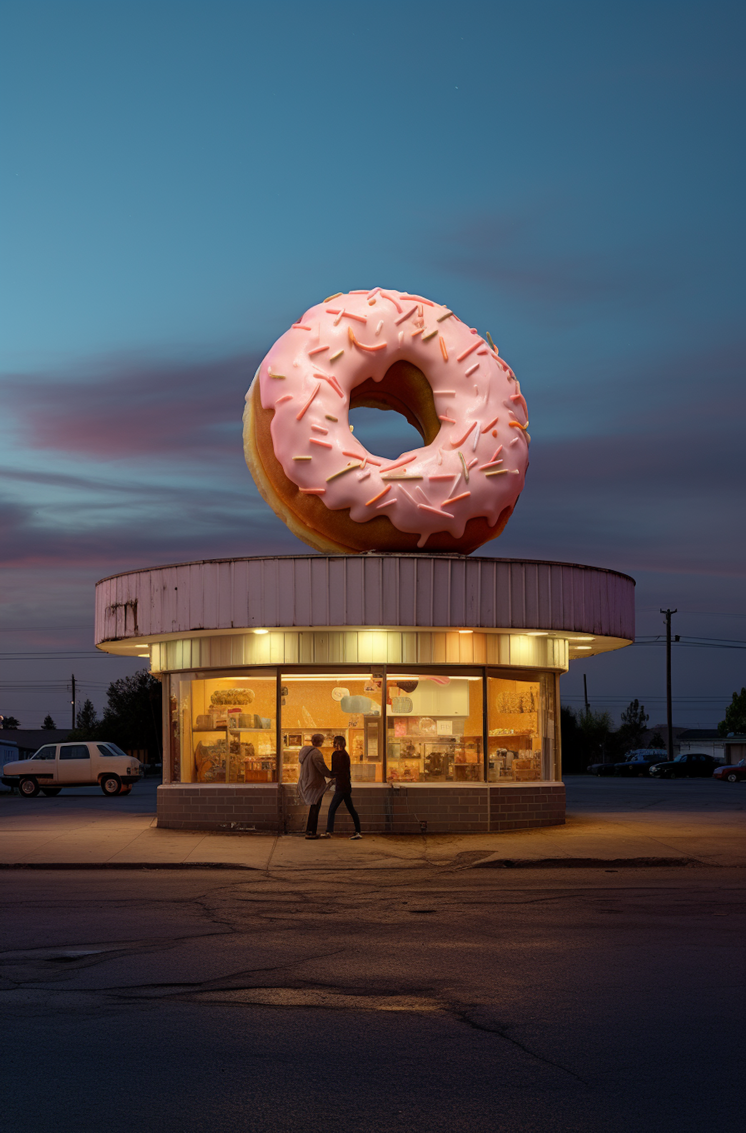 Retro donut shop with giant pink donut on roof at twilight, couple walking hand in hand, vintage car nearby.