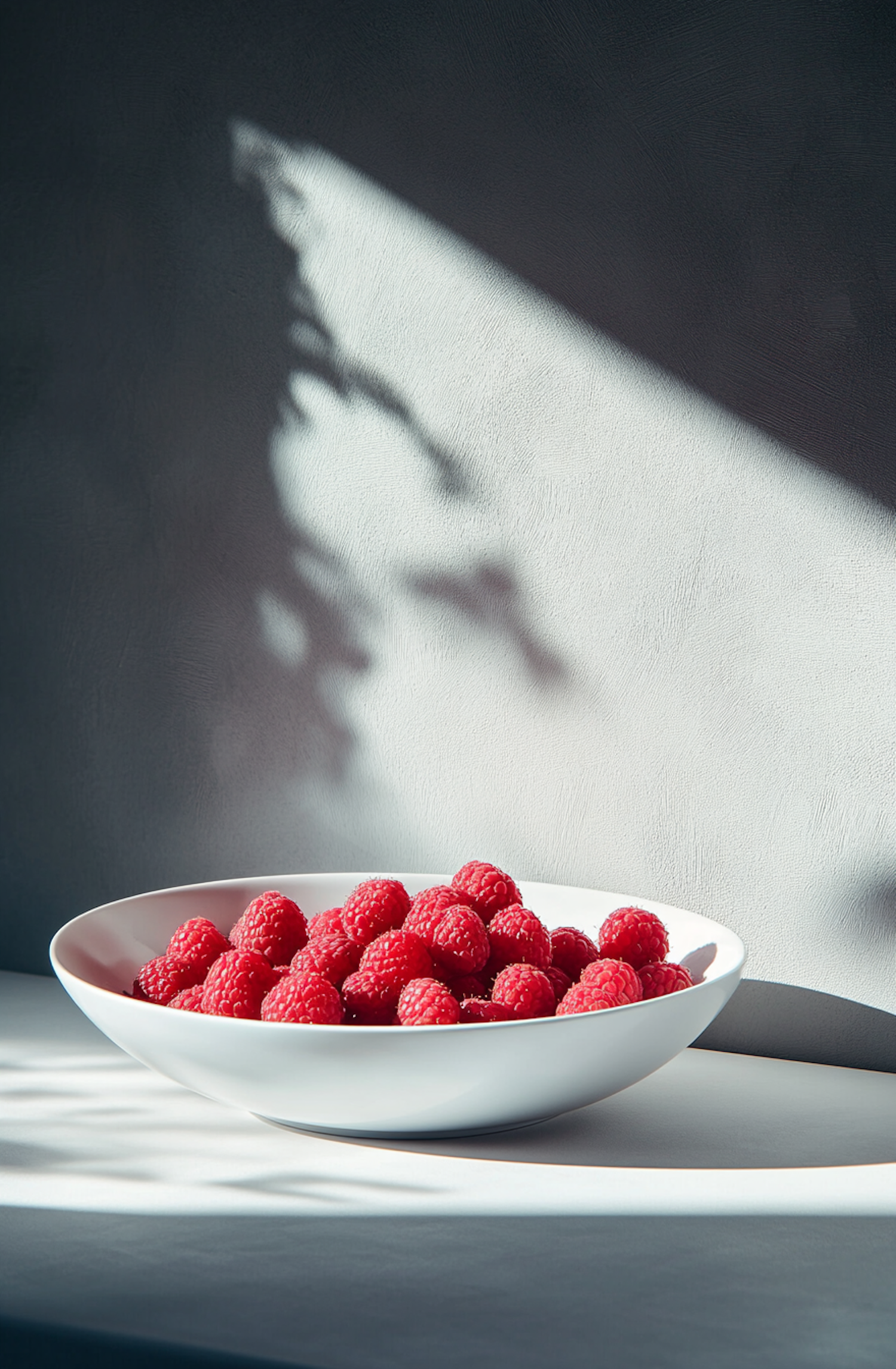 A white bowl filled with fresh red raspberries on a light surface, with soft foliage shadows on a gray background.