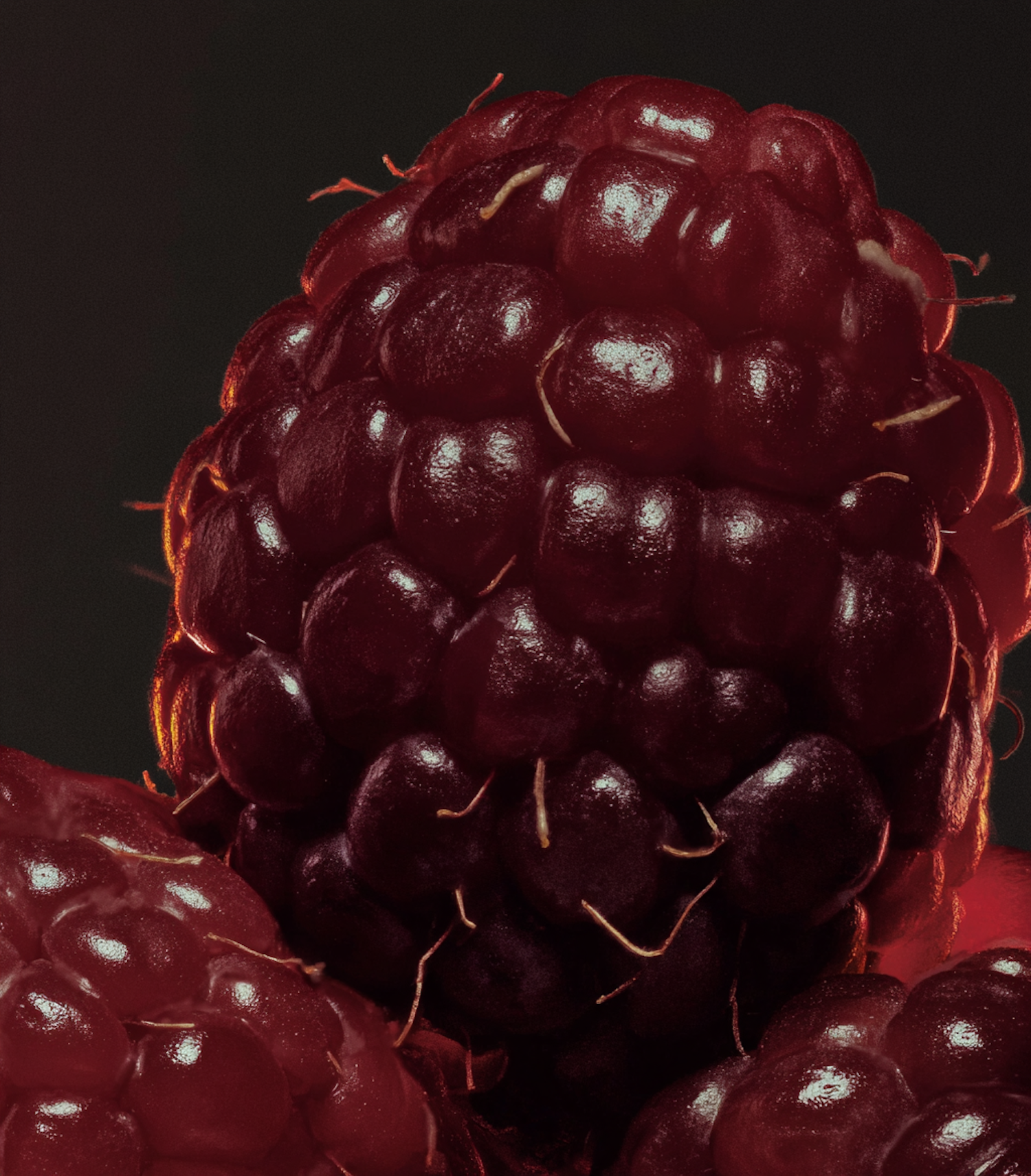 Close-up of a vibrant raspberry with detailed texture and glistening surface, set against a dark background for contrast.