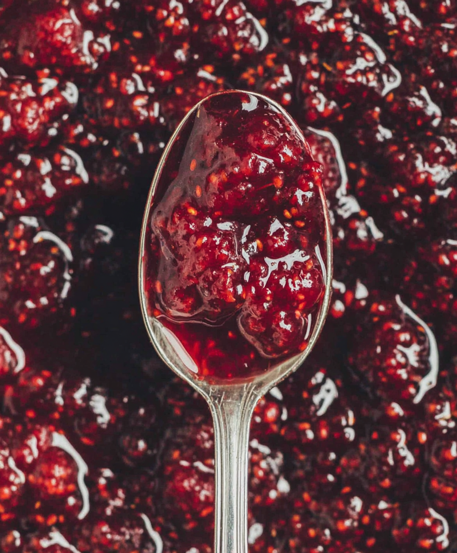 Close-up of a spoonful of glossy, textured raspberry jam with visible seeds, surrounded by a rich, vibrant red jam background.