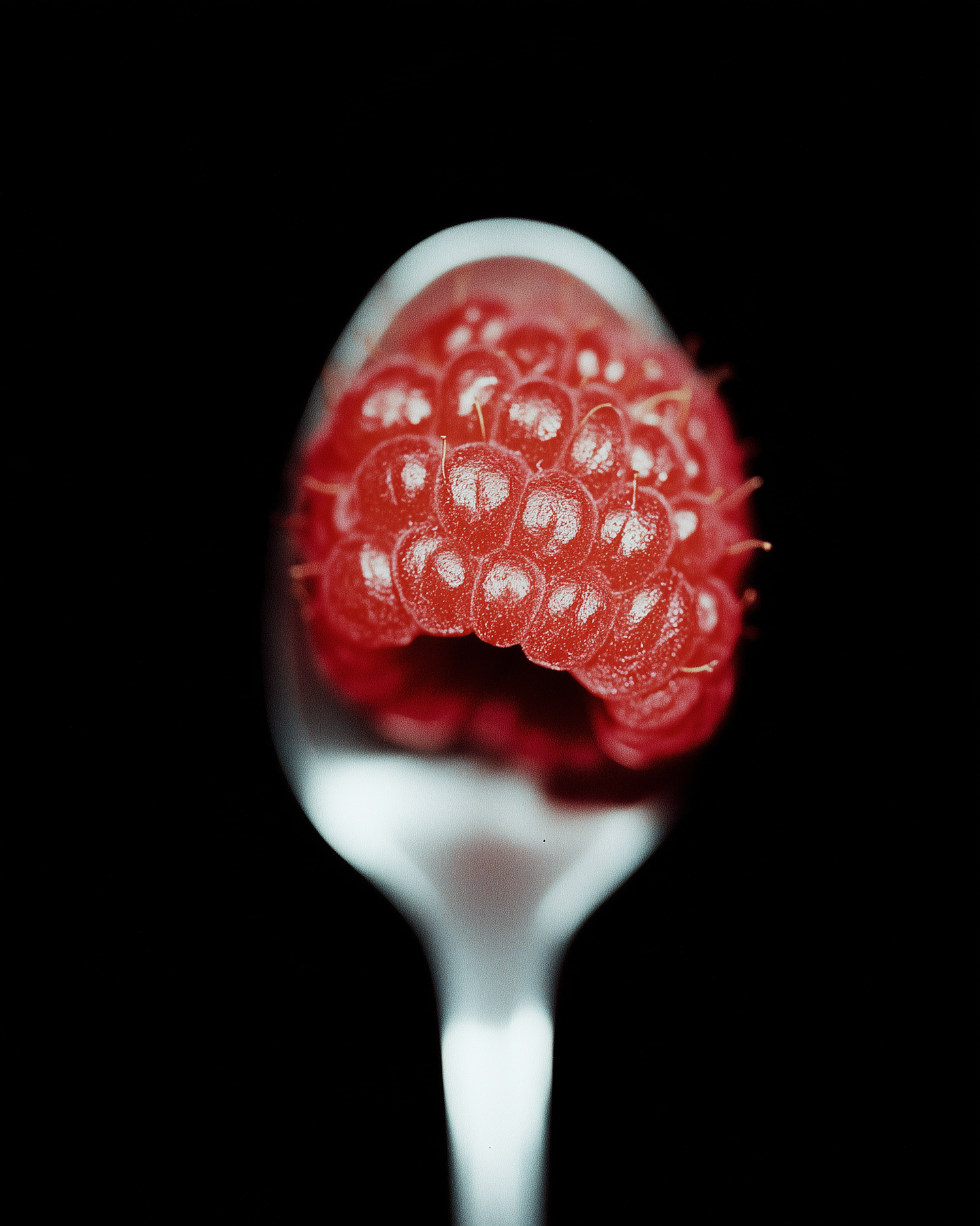 Close-up of a juicy red raspberry on a silver spoon, set against a black background. Minimalist and vibrant food photography.