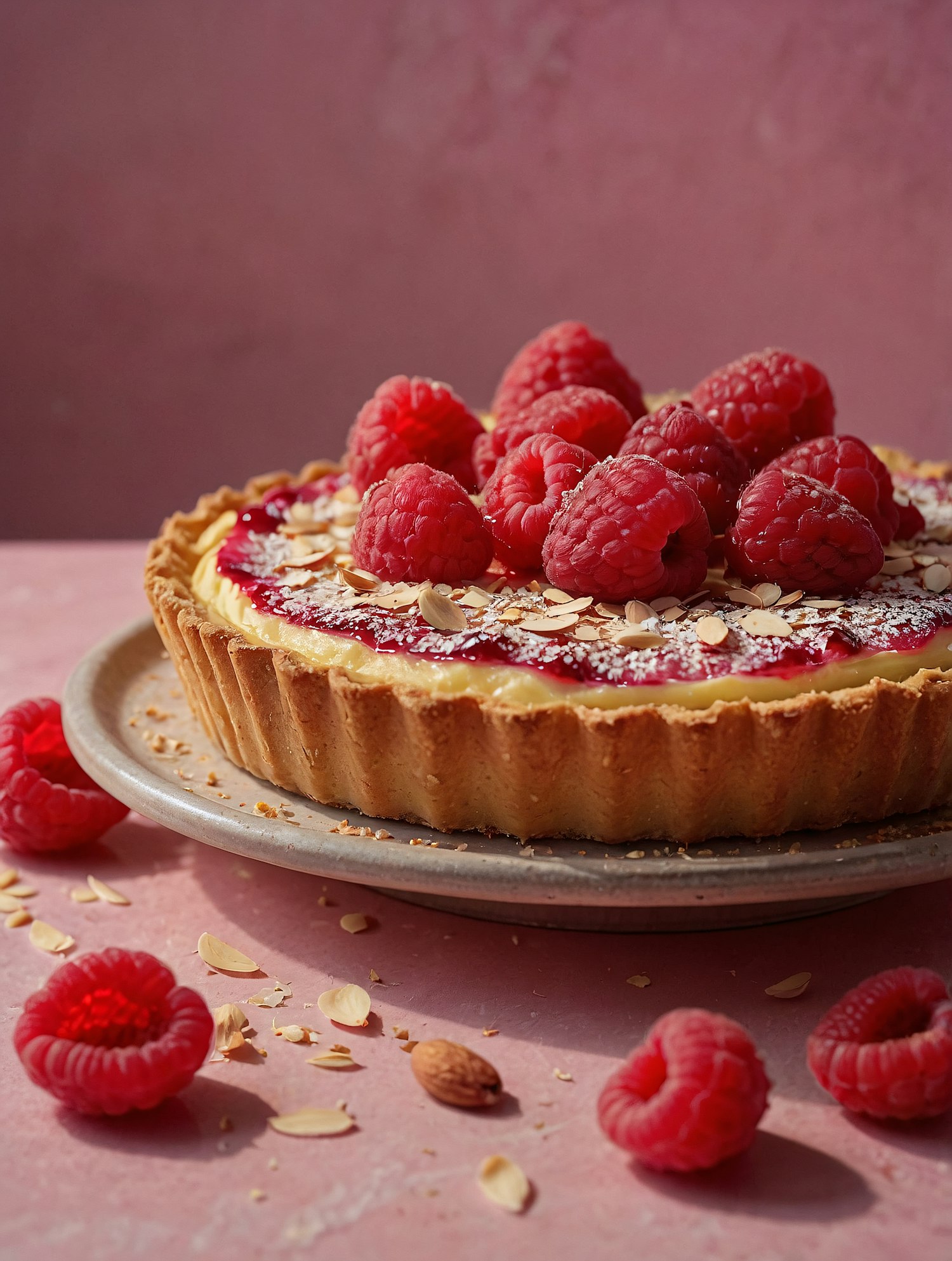 Golden tart with custard, raspberry compote, fresh raspberries, almonds, and powdered sugar on a pink backdrop. Perfect dessert vibes!